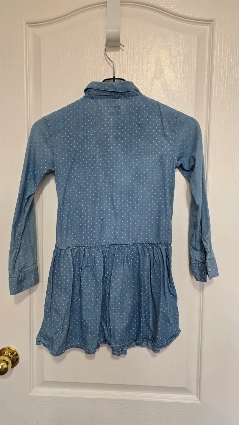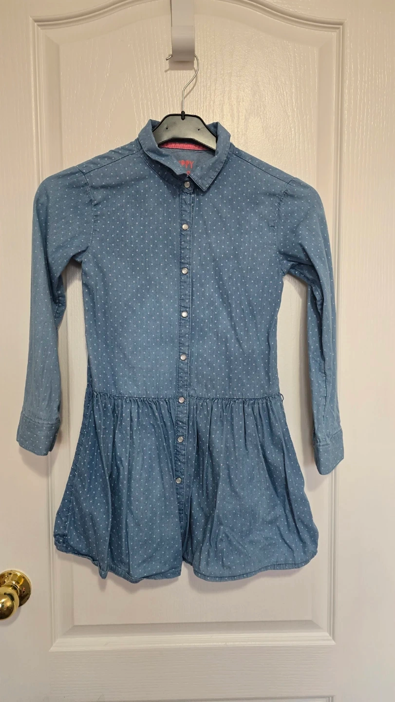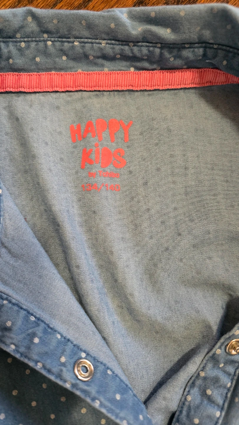 This is a cute blue denim dress from Happy Kids. It features a classic button-up front and a gathered hemline. The fabric is soft and comfortable for little ones. The dress is adorned with a white polka dot pattern.