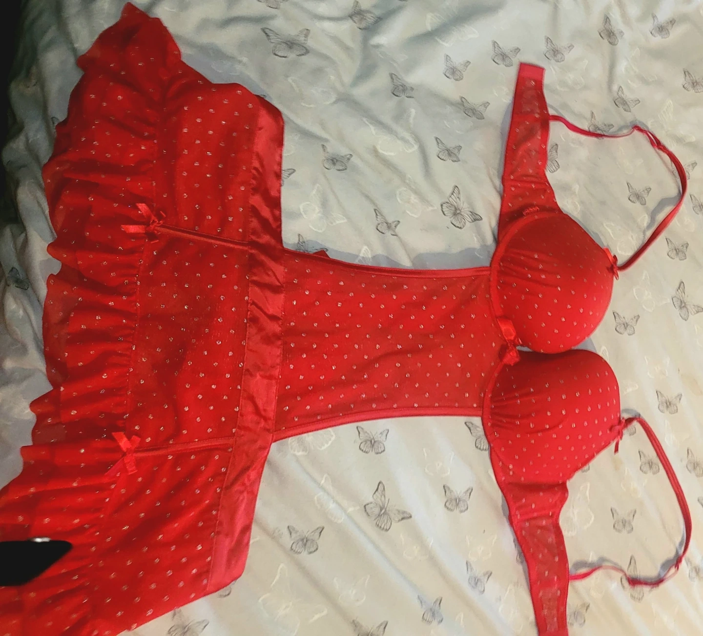 This red lingerie set from La Senza includes a bra and garter belt with a sparkle detail. The bra is size LG and the set has a festive look. It's a pretty addition to any lingerie collection!