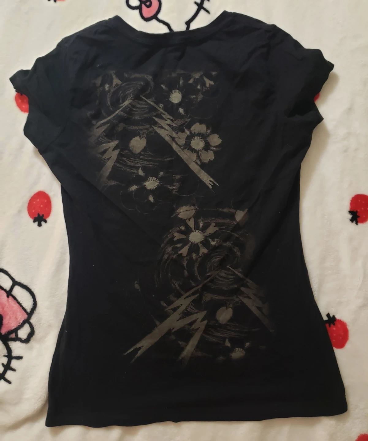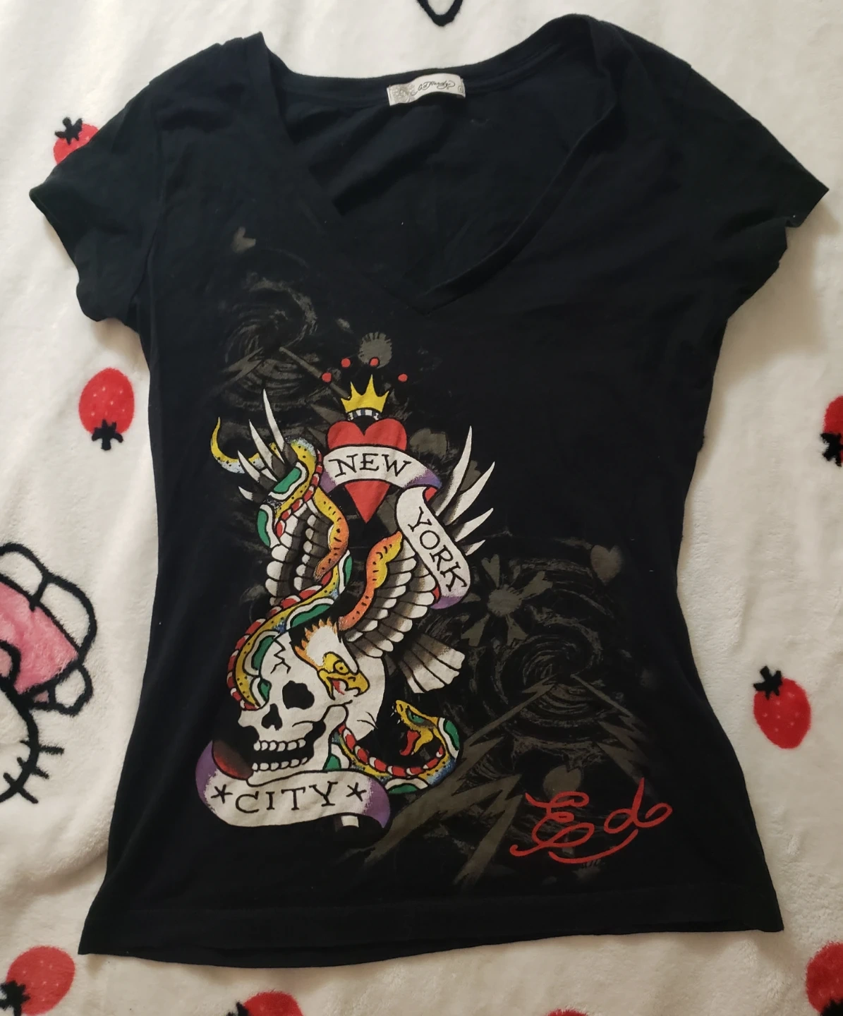 Selling Ed Hardy's signature "New York City" skull graphic on the front and a floral design on the back. Short sleeves and a comfortable fit. It says size L but can fit a M or even S.