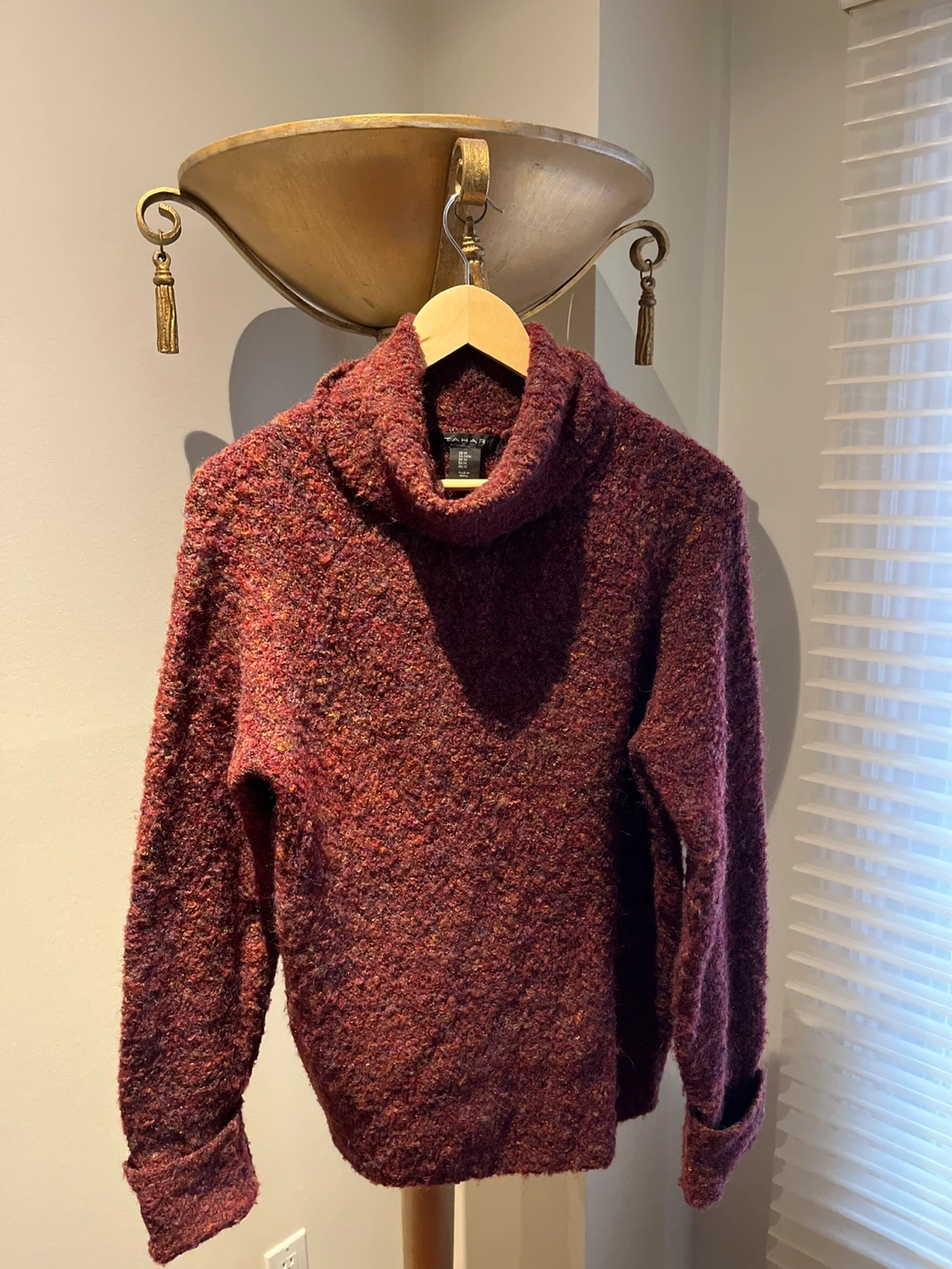 Cozy knit turtleneck sweater from Tahari. It's a rich burgundy colour with multicoloured flecks throughout. The material feels soft and textured. Perfect for cooler weather!