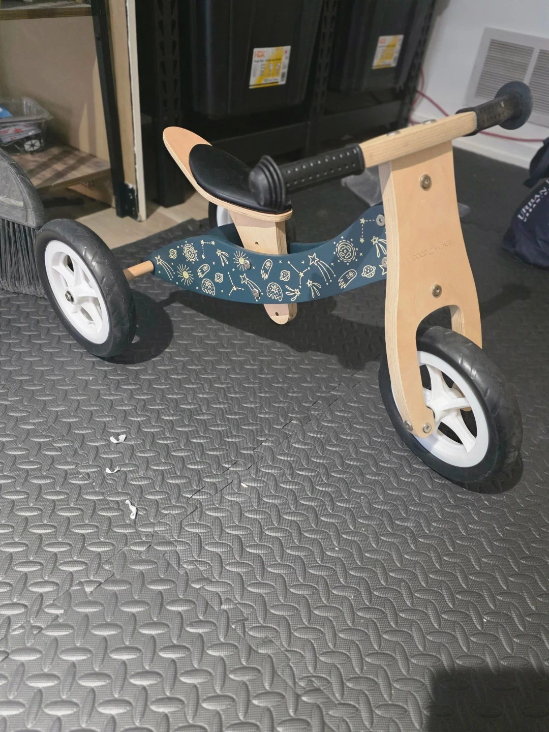 This is a COCO VILLAGE wooden balance bike. It's made with a sturdy wooden frame and has a comfortable seat. The decorative side panel features a fun celestial pattern. This bike is great for toddlers learning to balance!