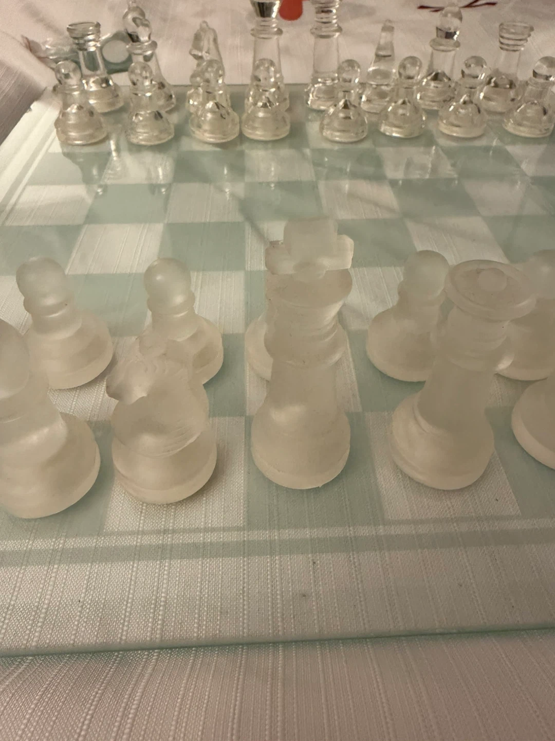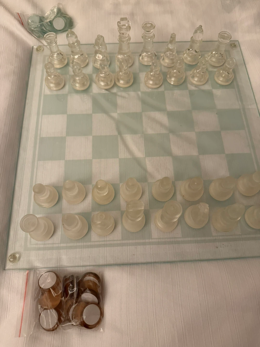 Selling a glass chess set. It comes complete with all the pieces. It also includes the original box! Small chip on board in corner. Also pieces for alternative game of checkers.