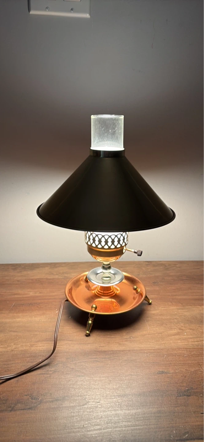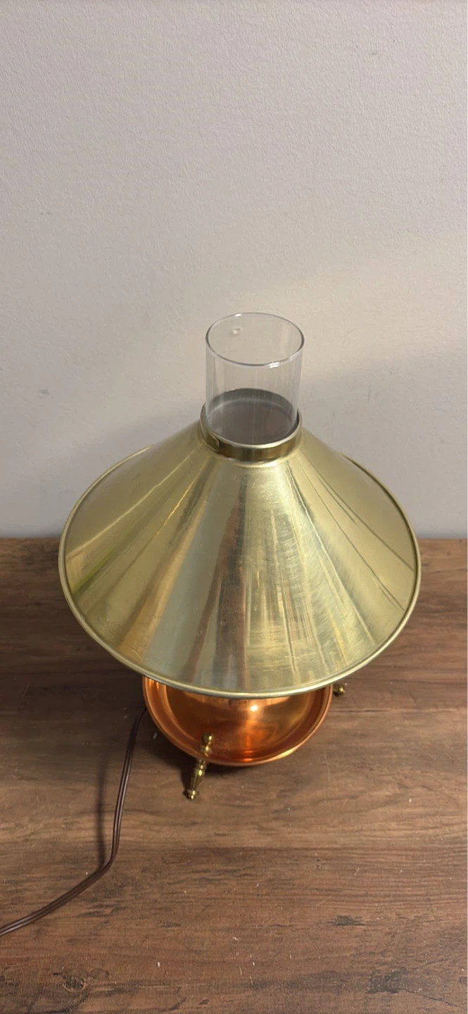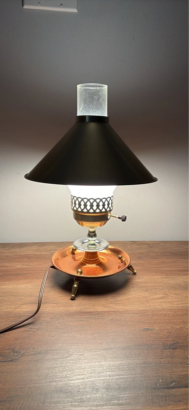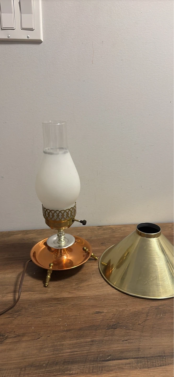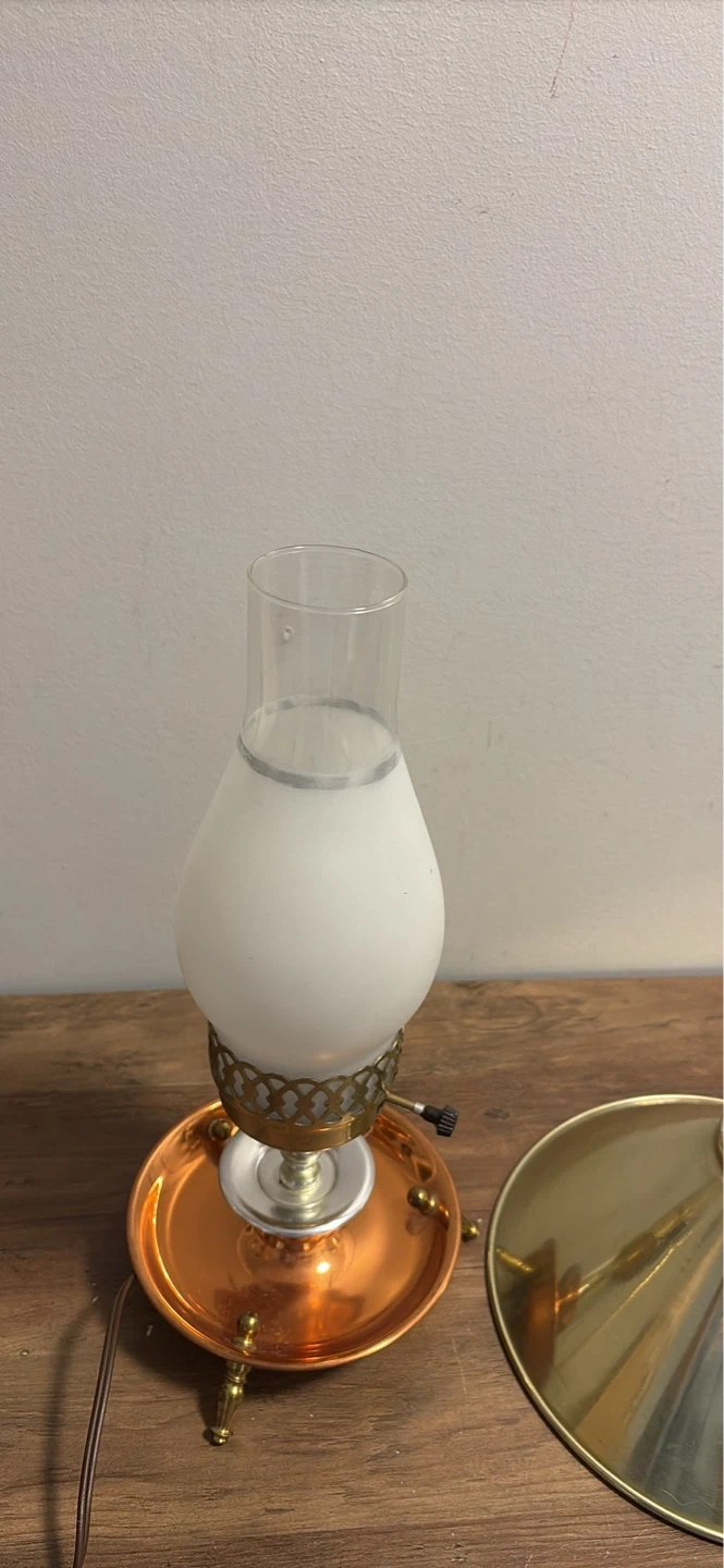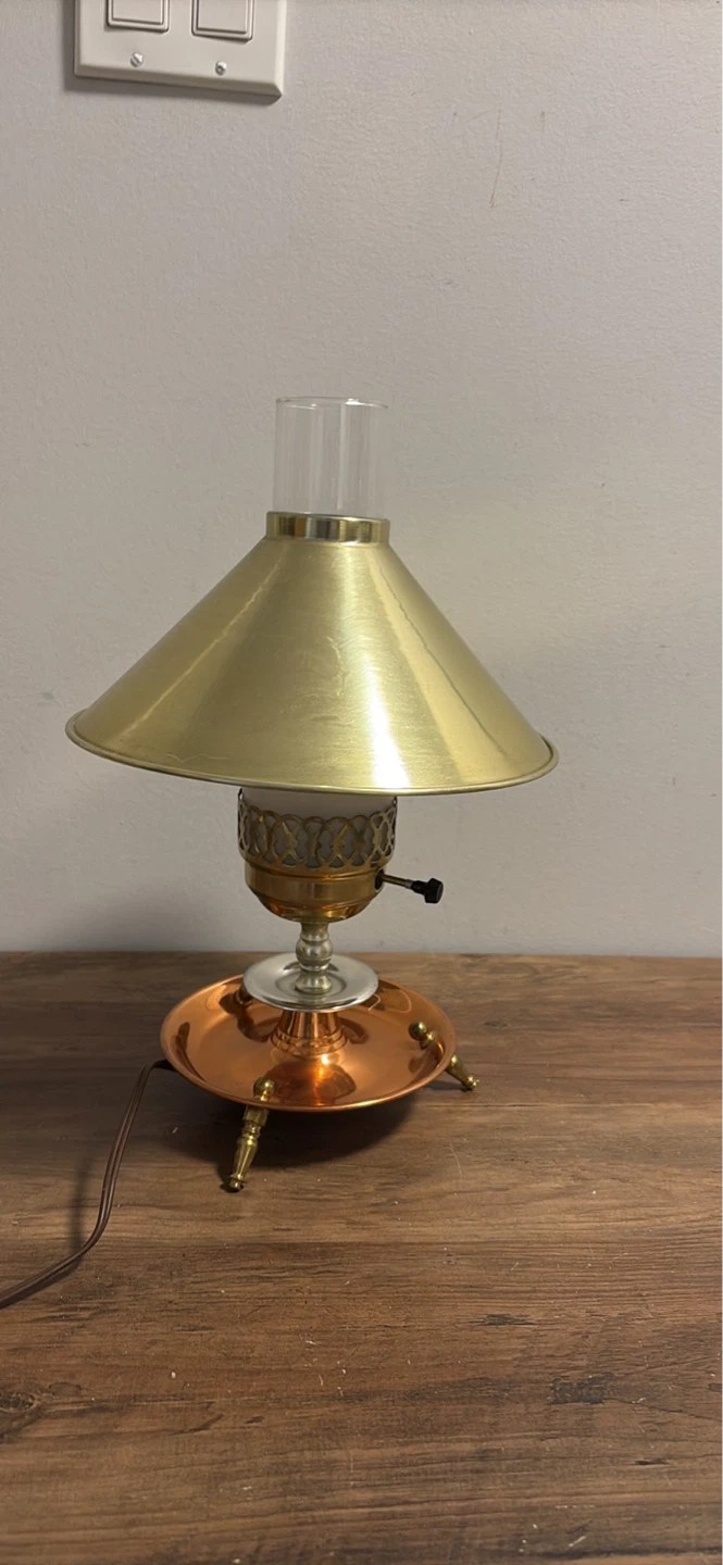 This vintage table lamp features a brass-finished conical shade and a copper base with decorative legs. It has a clear glass chimney with a frosted glass insert.It's a charming piece for any room!