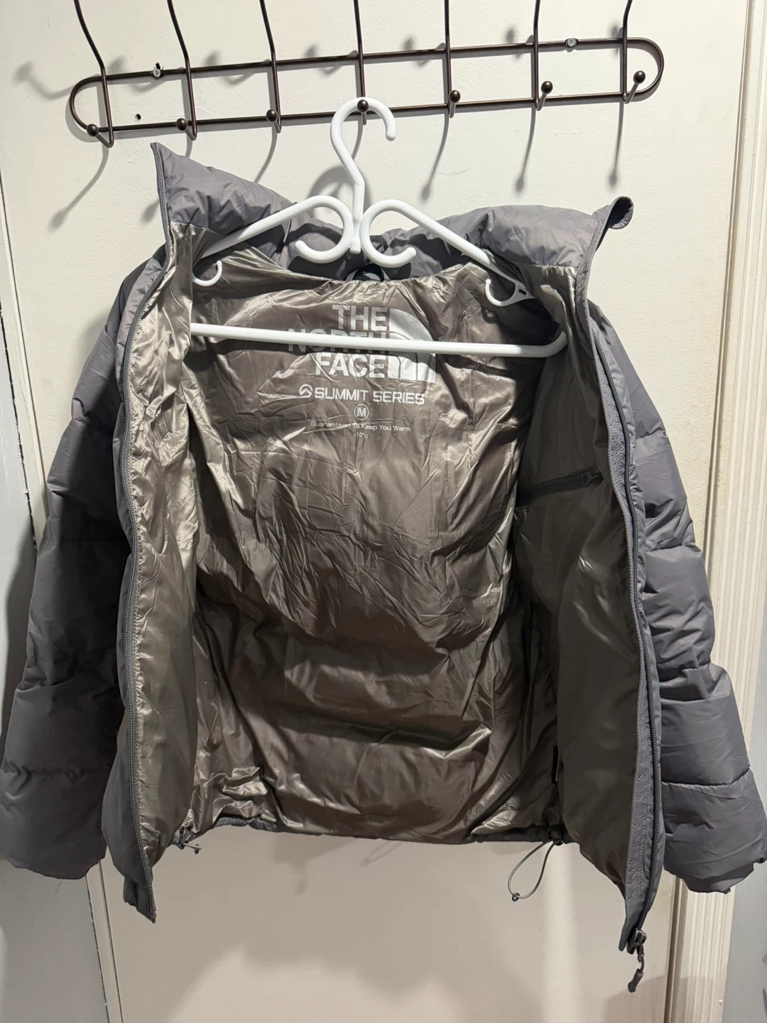 This is a grey puffer jacket from The North Face, Summit Series. It's a size medium and features a full-zip closure and hood. It's designed for warmth and protection.