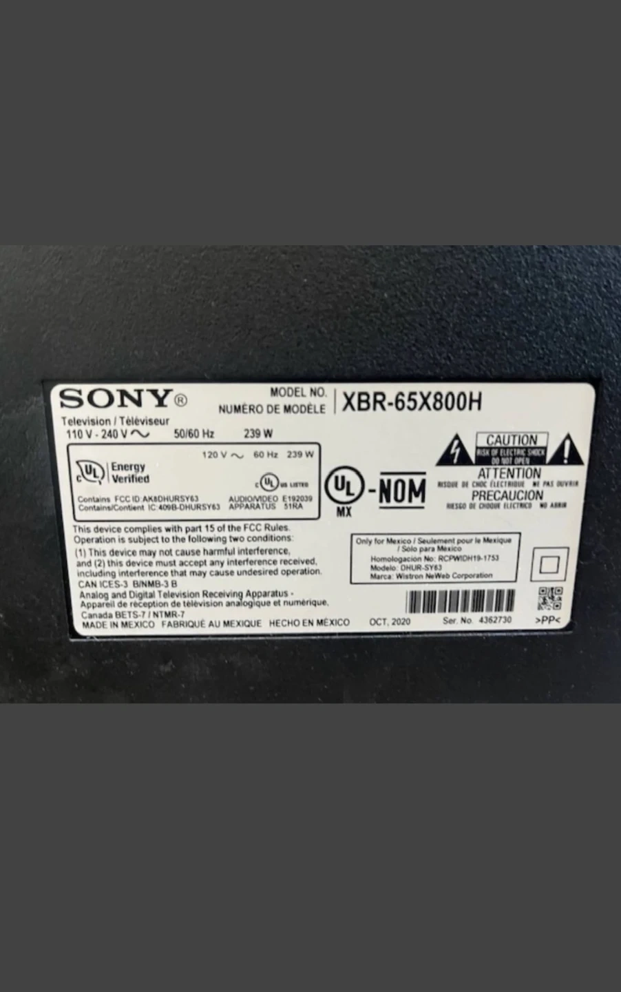 Sony 65-inch smart TV, model XBR-65X800H. Manufactured October 2020. It's a 4K UHD HDR television with a 120 Hz refresh rate. This TV is perfect for an immersive home entertainment experience!
