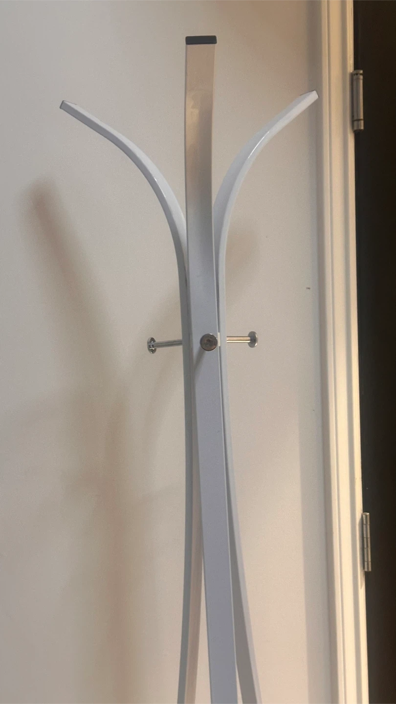 A modern white coat rack designed to hold your jackets and accessories. It features multiple hooks and a convenient shelf at the bottom for additional storage. This rack's sleek design makes it a practical addition to any entryway.