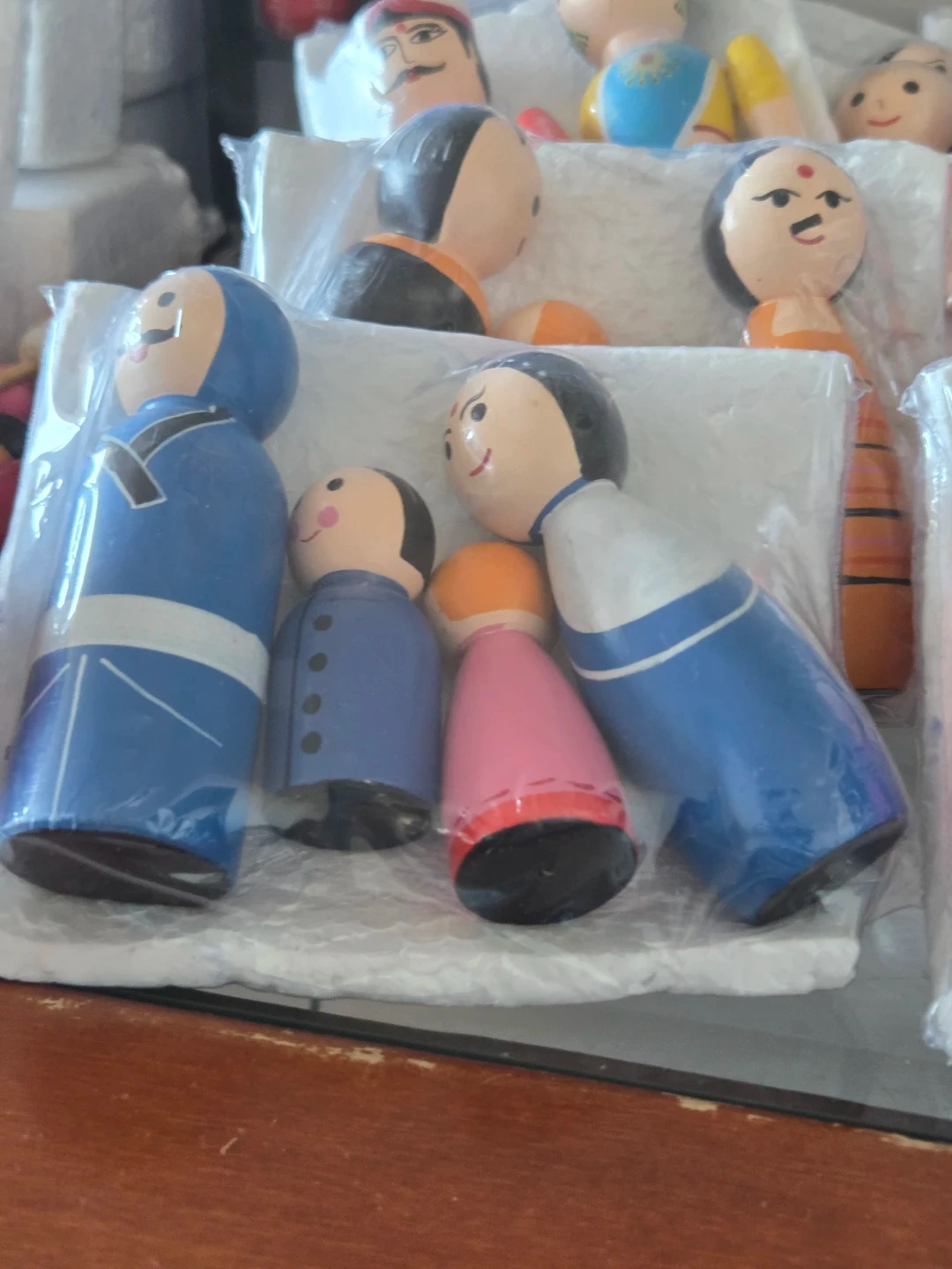 This is a set of wooden peg dolls representing a family. They are hand-painted with traditional clothing. These would make a lovely addition to a child's play collection or a decorative display piece.