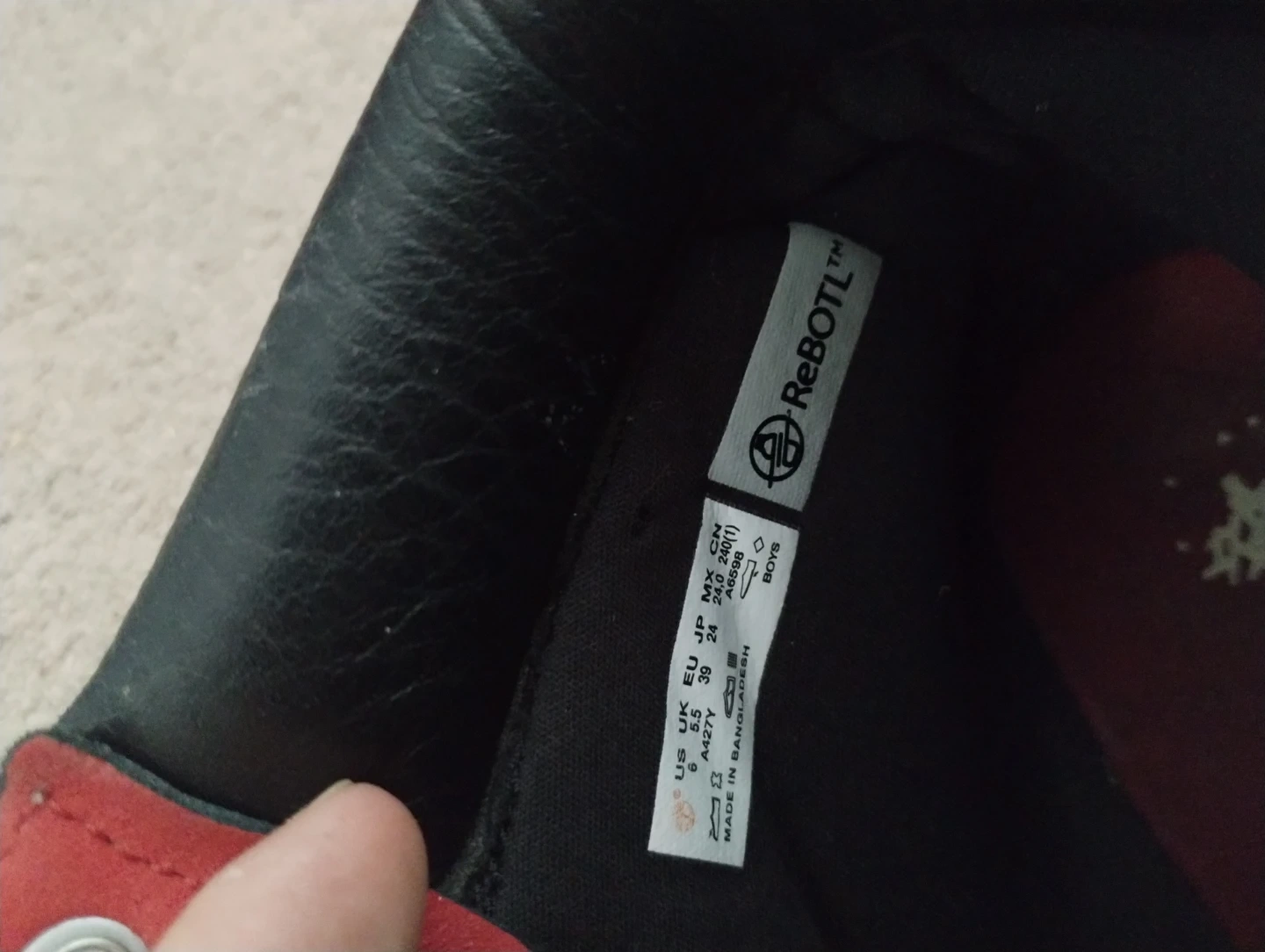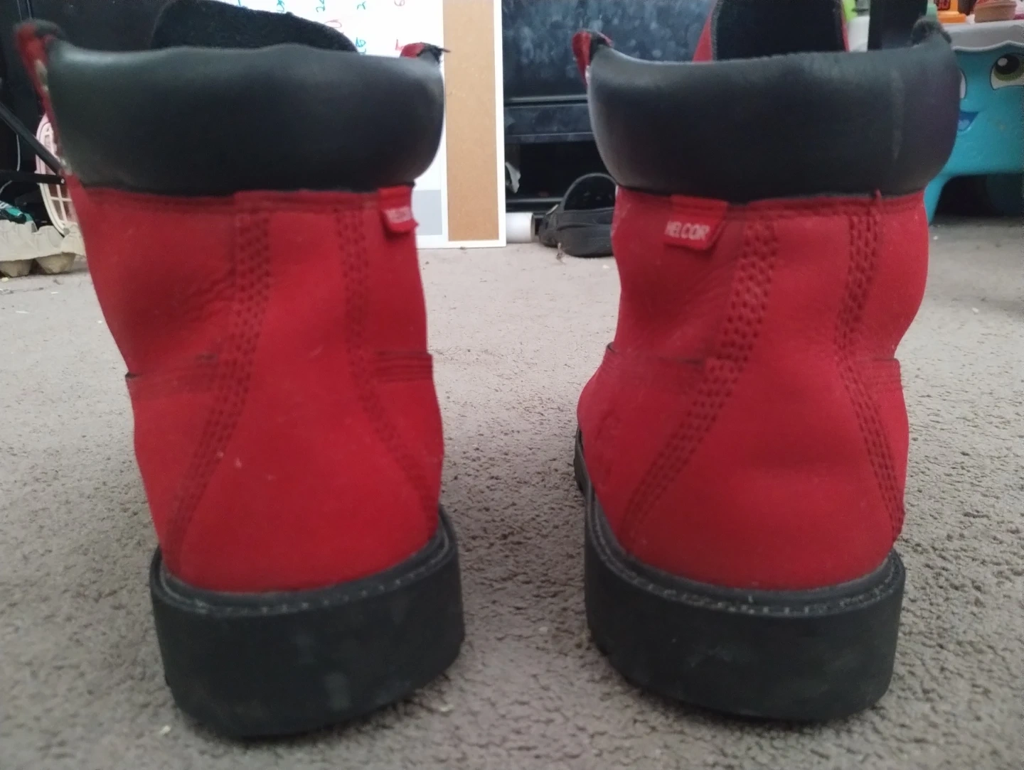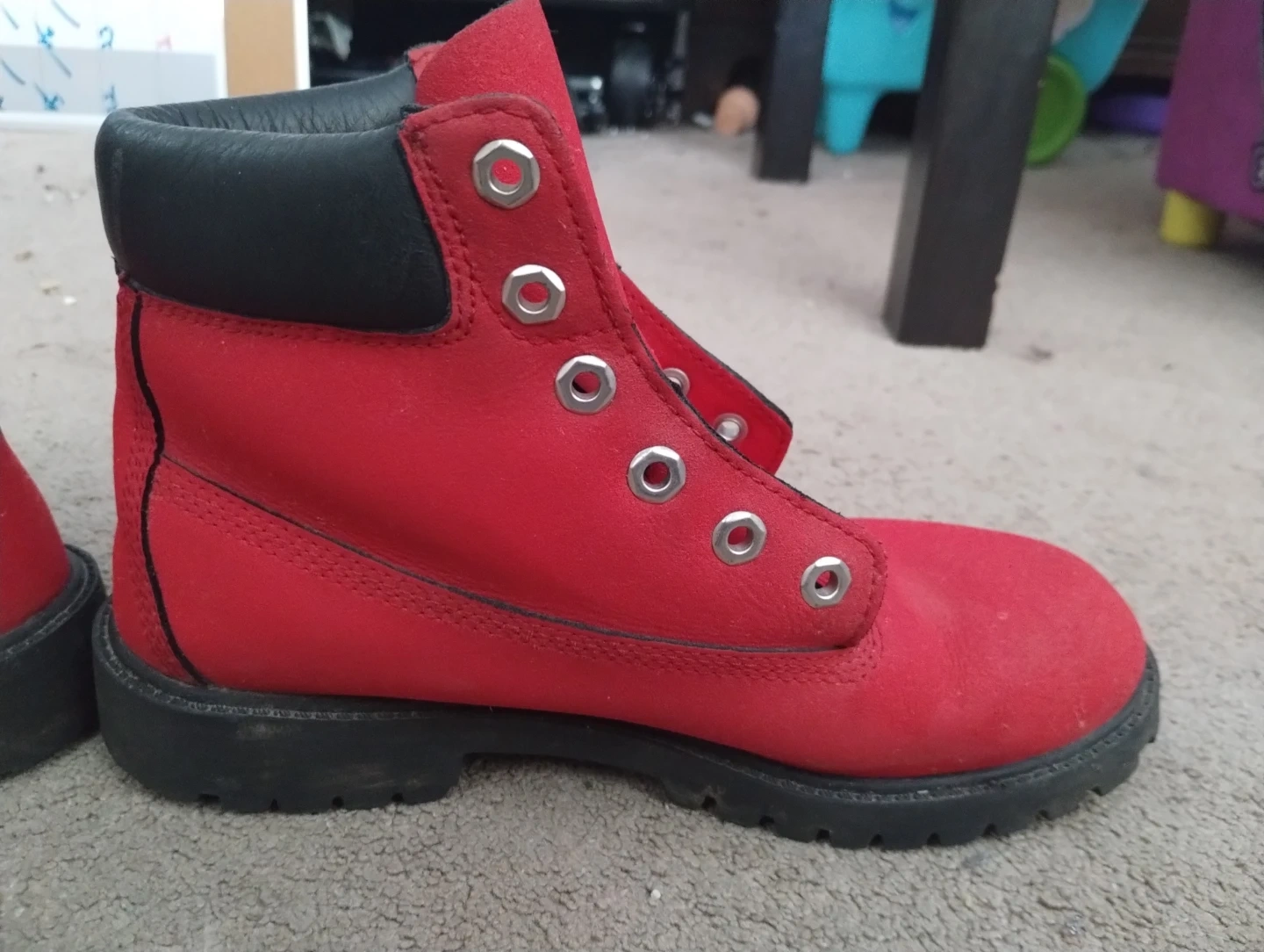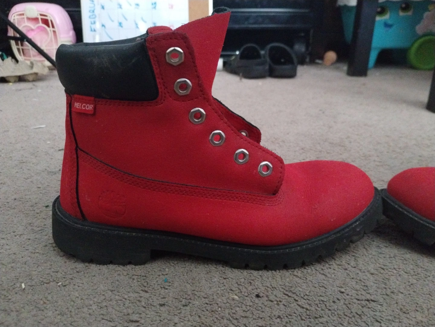 These are red Timberland boots with black trim. They're made of suede material and are still in great condition, Size 6 and barely used