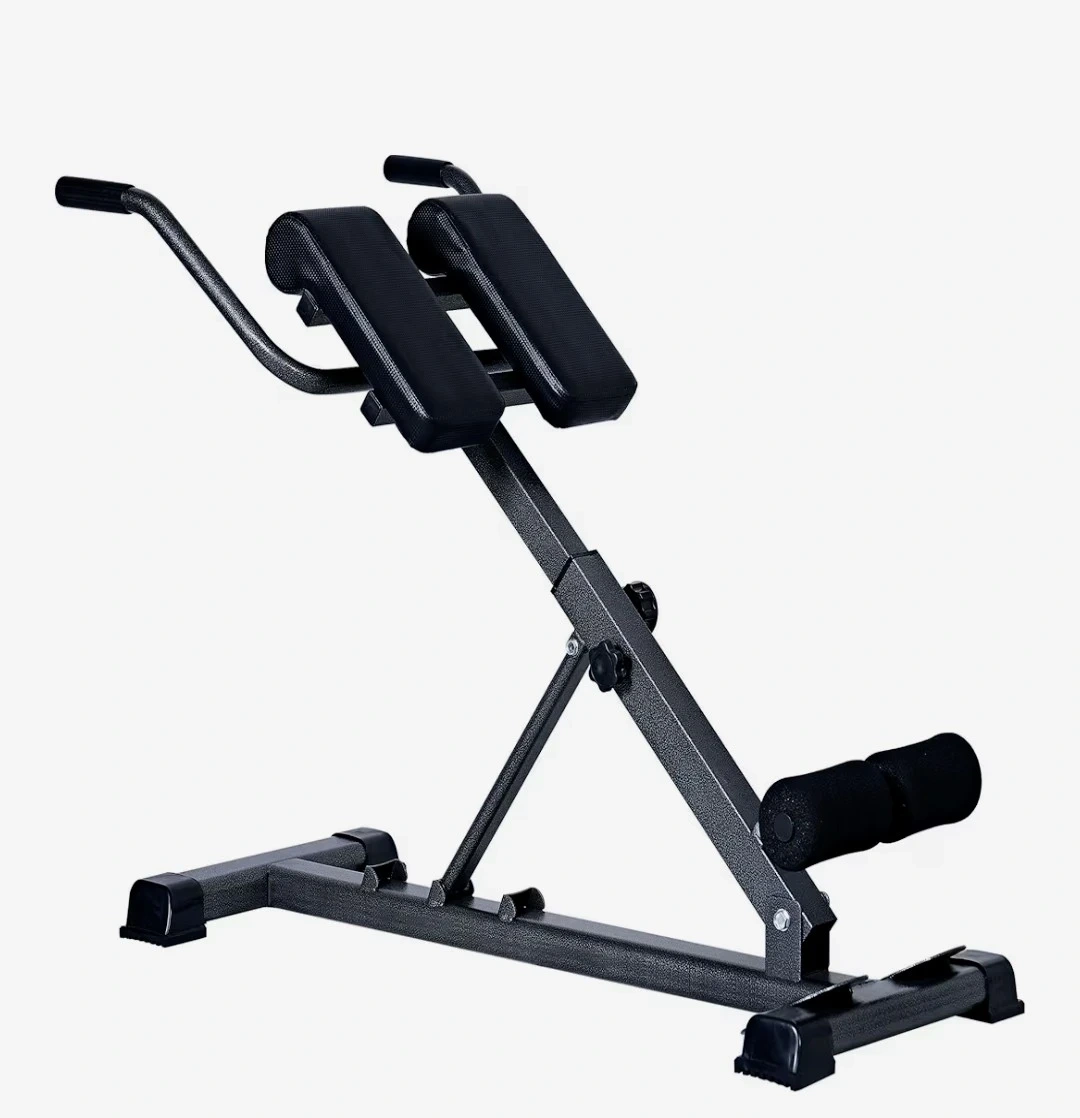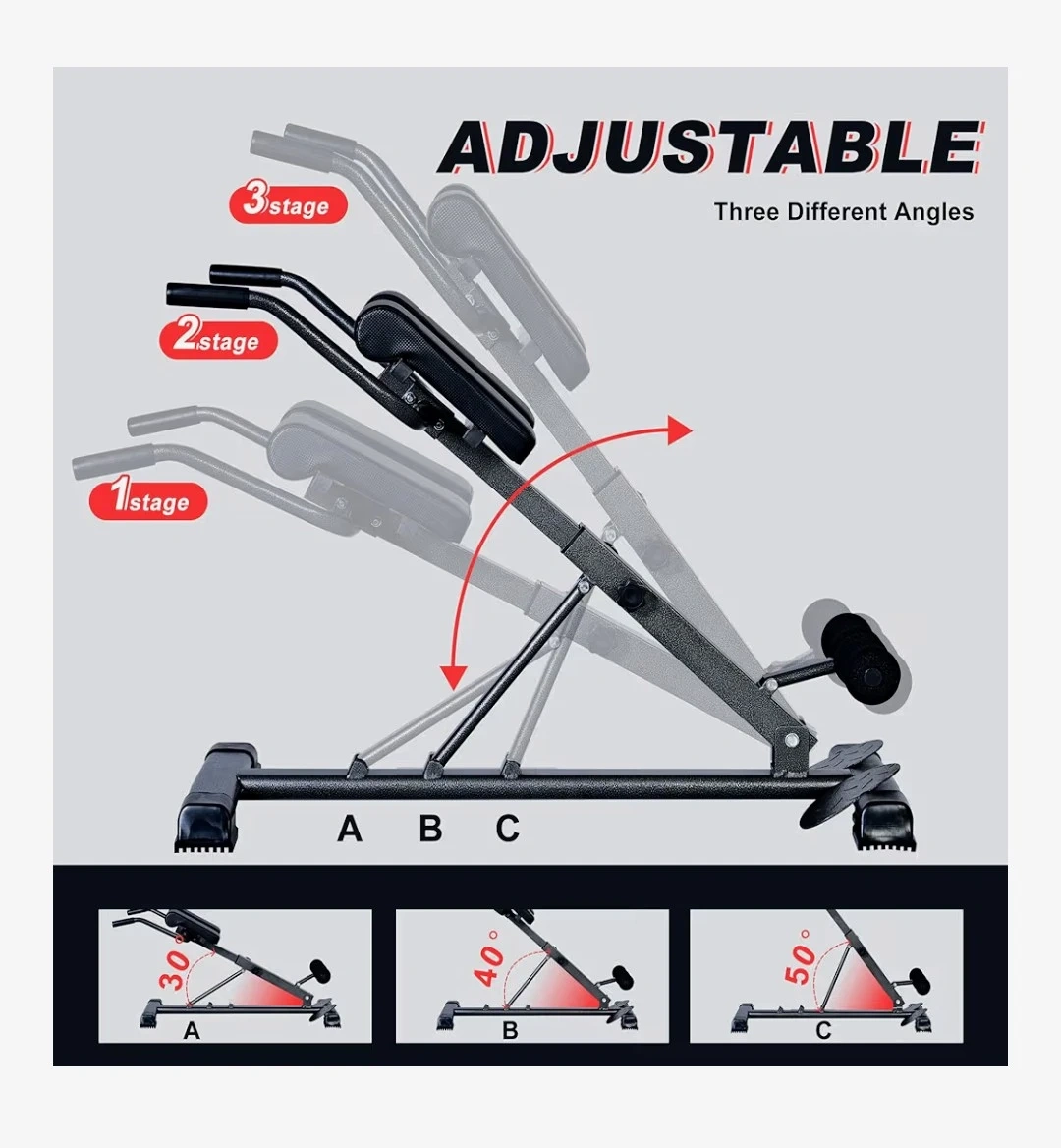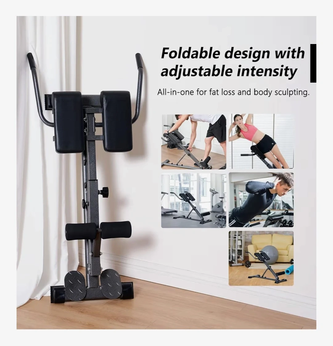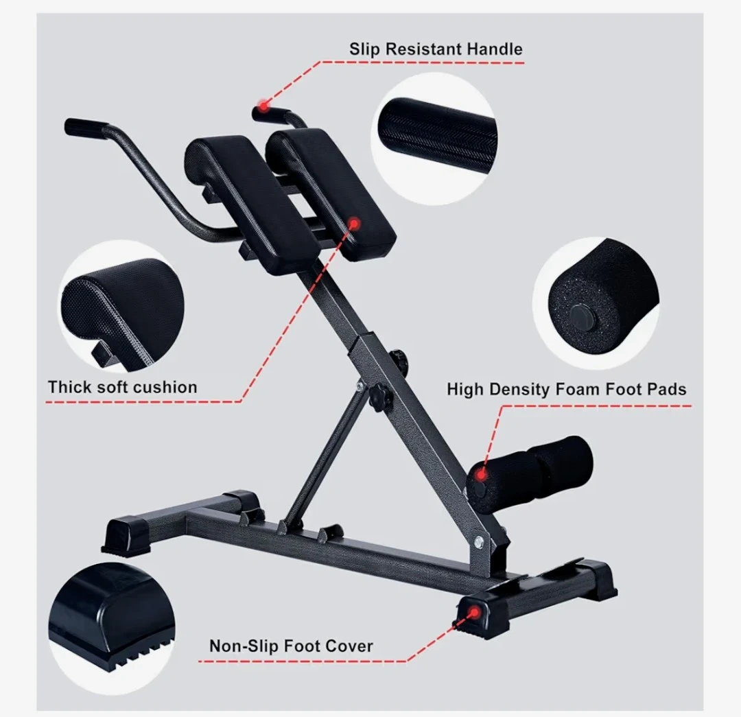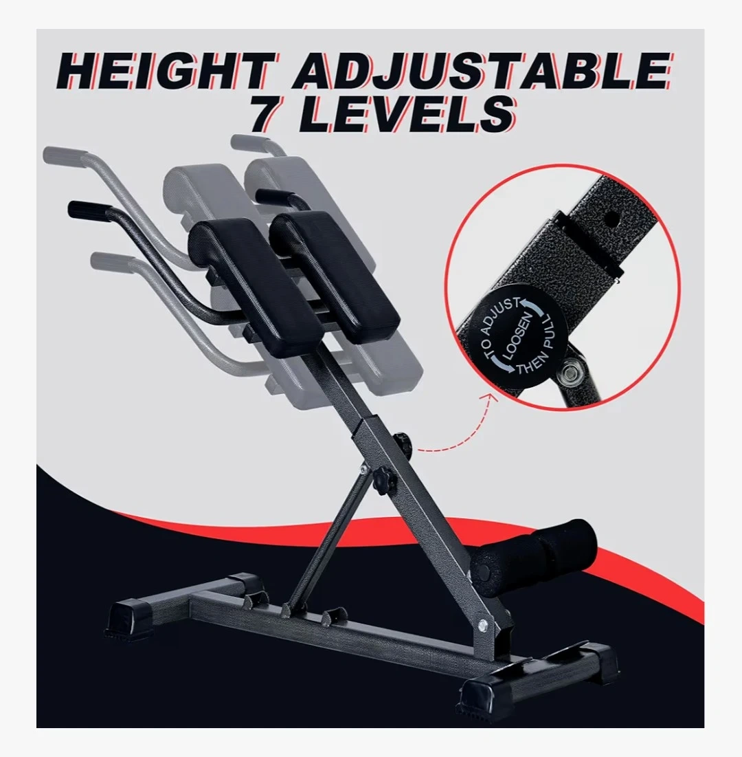 This Roman chair offers adjustable height with 7 levels and 3 different angles for various exercises. It features thick soft cushions and high-density foam foot pads for comfort. The design includes slip-resistant handles and non-slip foot covers for stability. It's also a foldable design with adjustable intensity, all-in-one for fat loss and body sculpting.