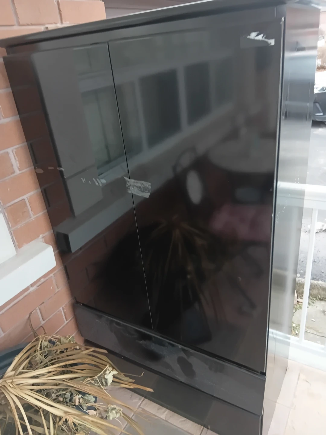 Black armoire with two doors. It's a tall, narrow unit. The finish is glossy and reflective. This cabinet offers storage space.in excellent shape asking 100