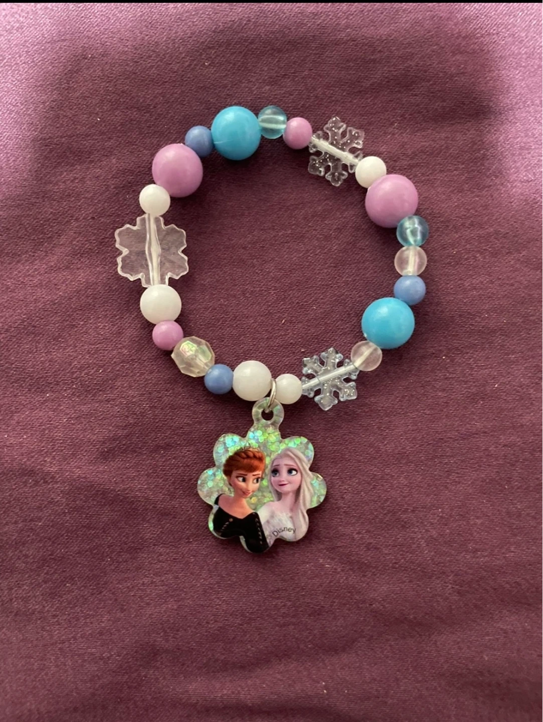 This bracelet features Elsa and Anna from Disney's Frozen! It's made with colourful beads in purple, blue, and white. Snowflake charms are included on the string.