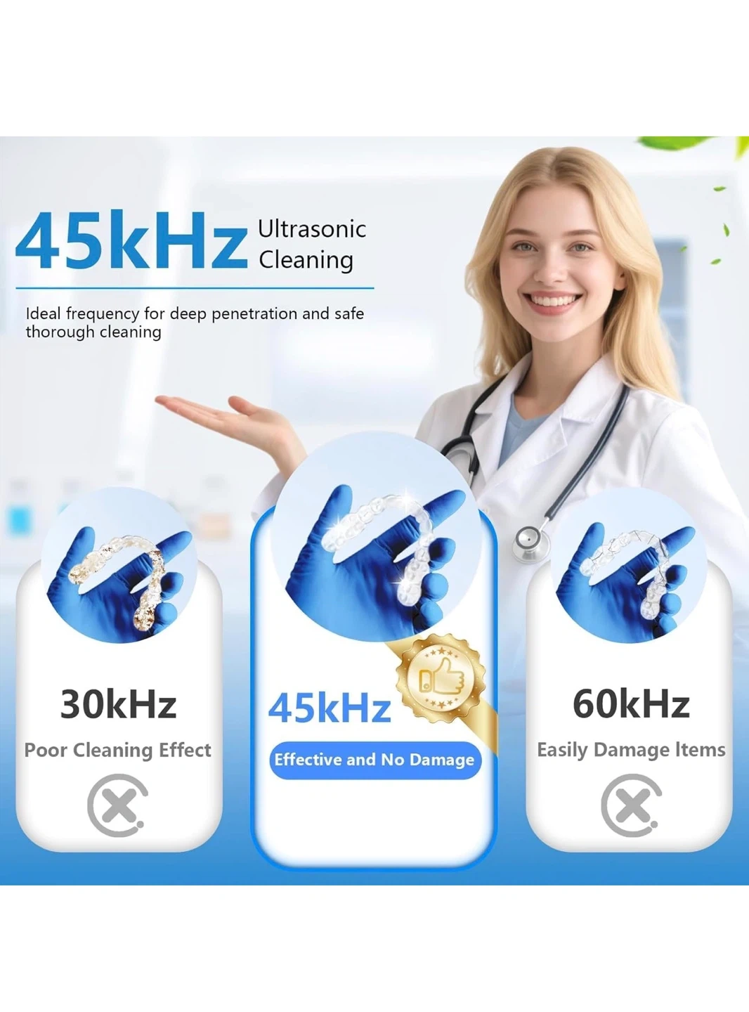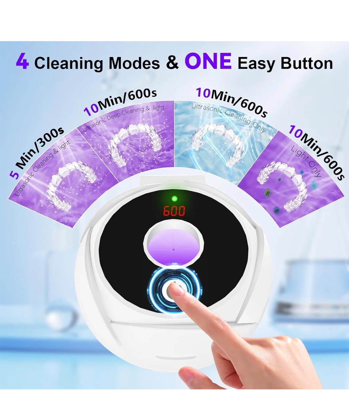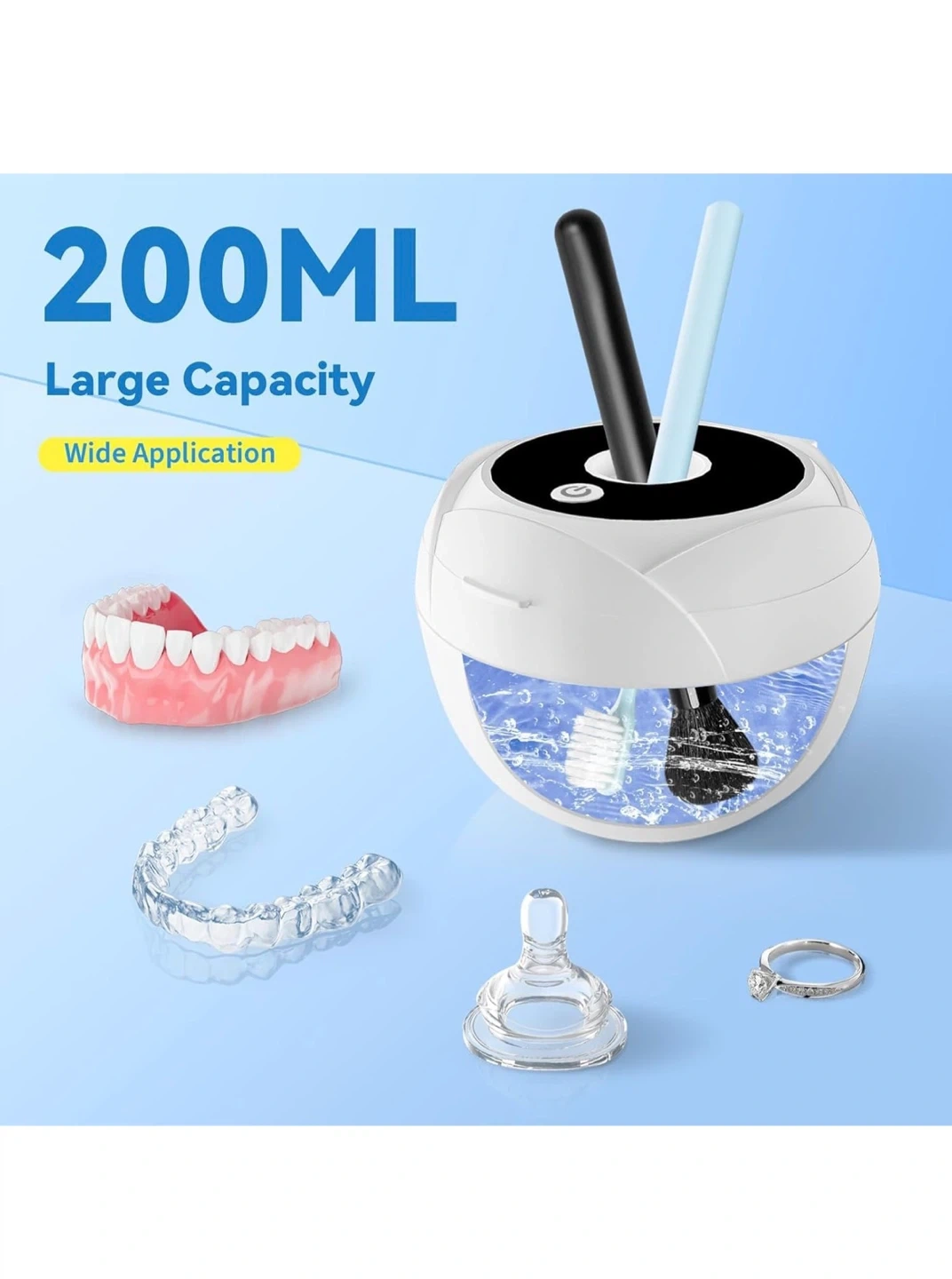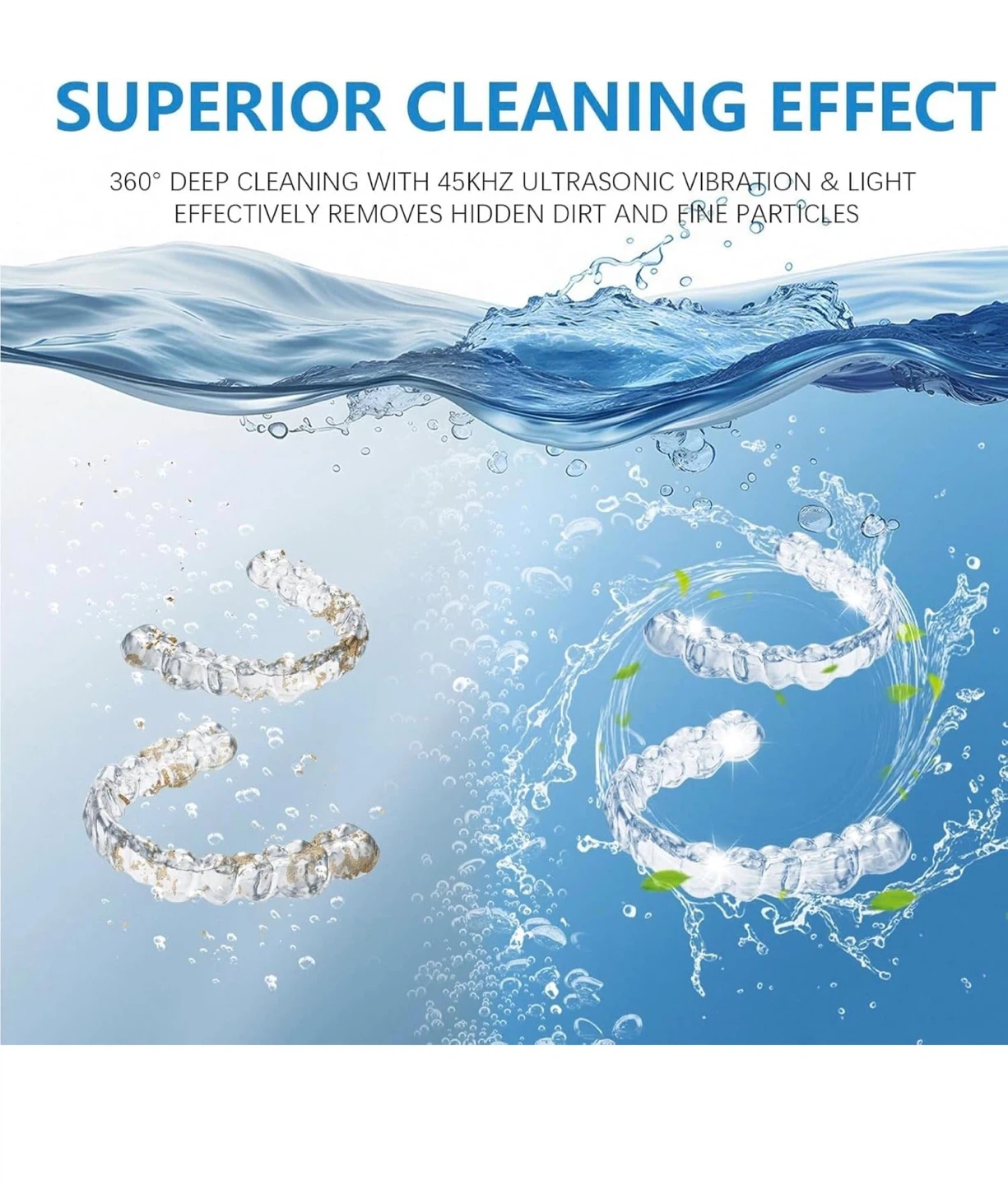 This ultrasonic cleaner machine offers 4 cleaning modes and a 200ml capacity. It kills 99.99% of bacteria and viruses using 45KHz ultrasonic vibrations and light. Use it for retainers, dentures, aligners, mouth guards, and jewelry!