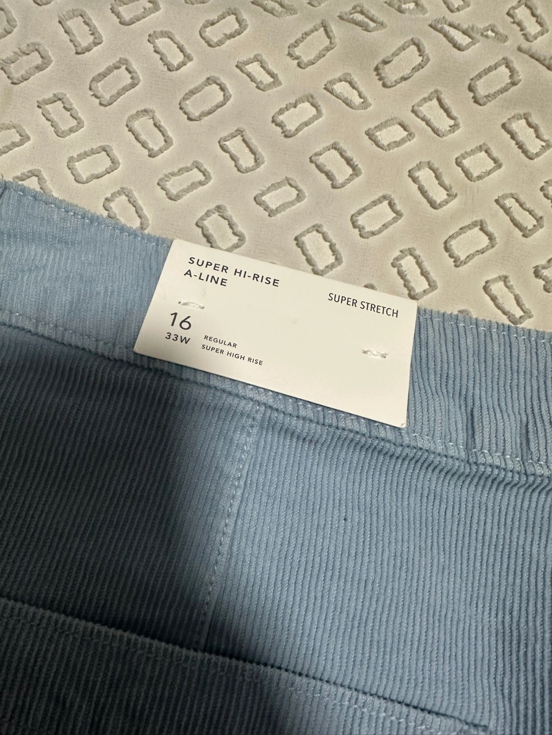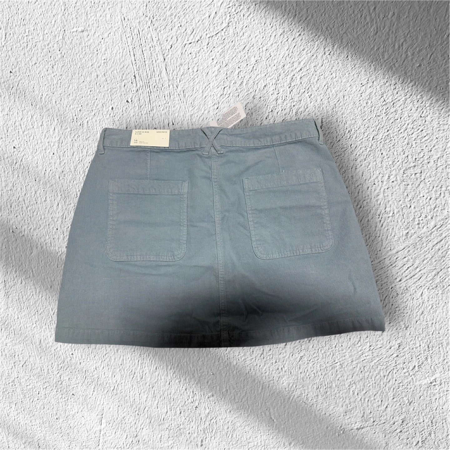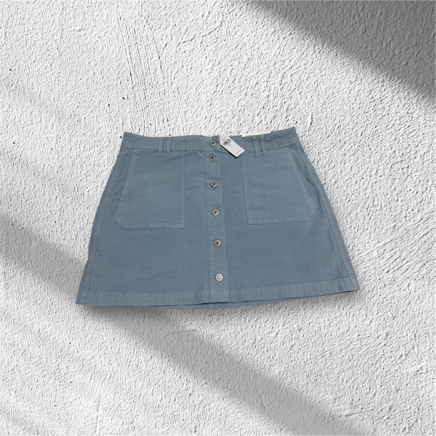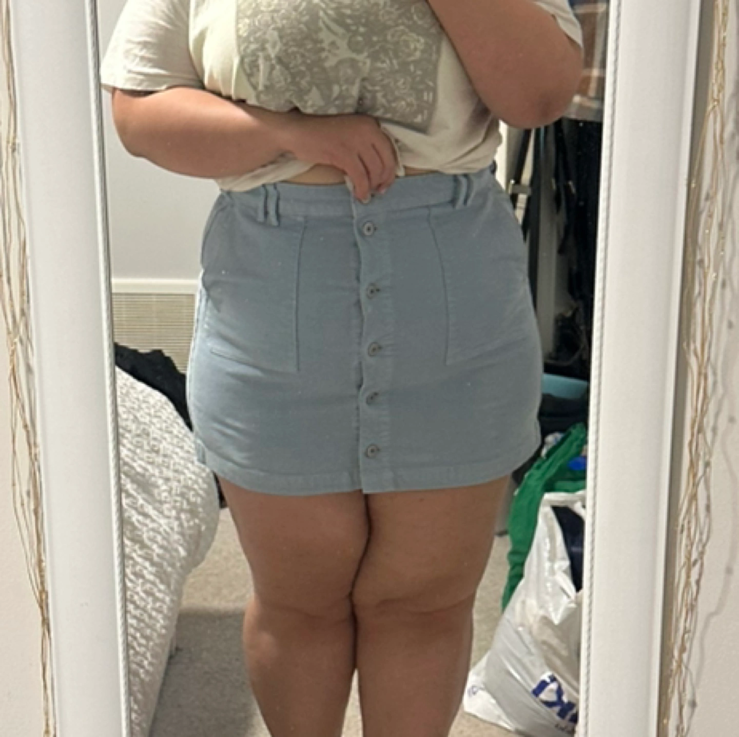 A-line, super high-rise, button up skirt. Super stretch, light blue colour.