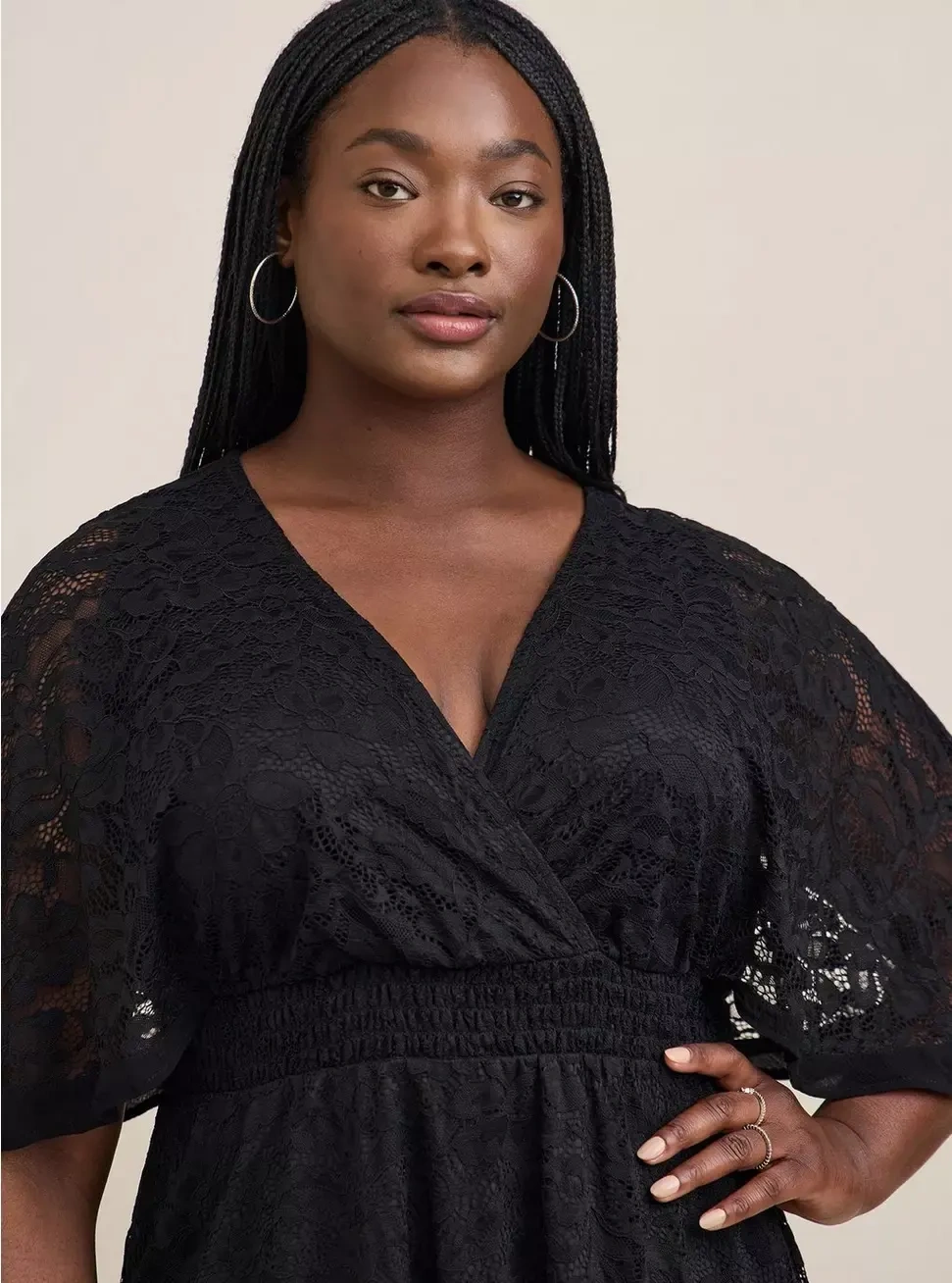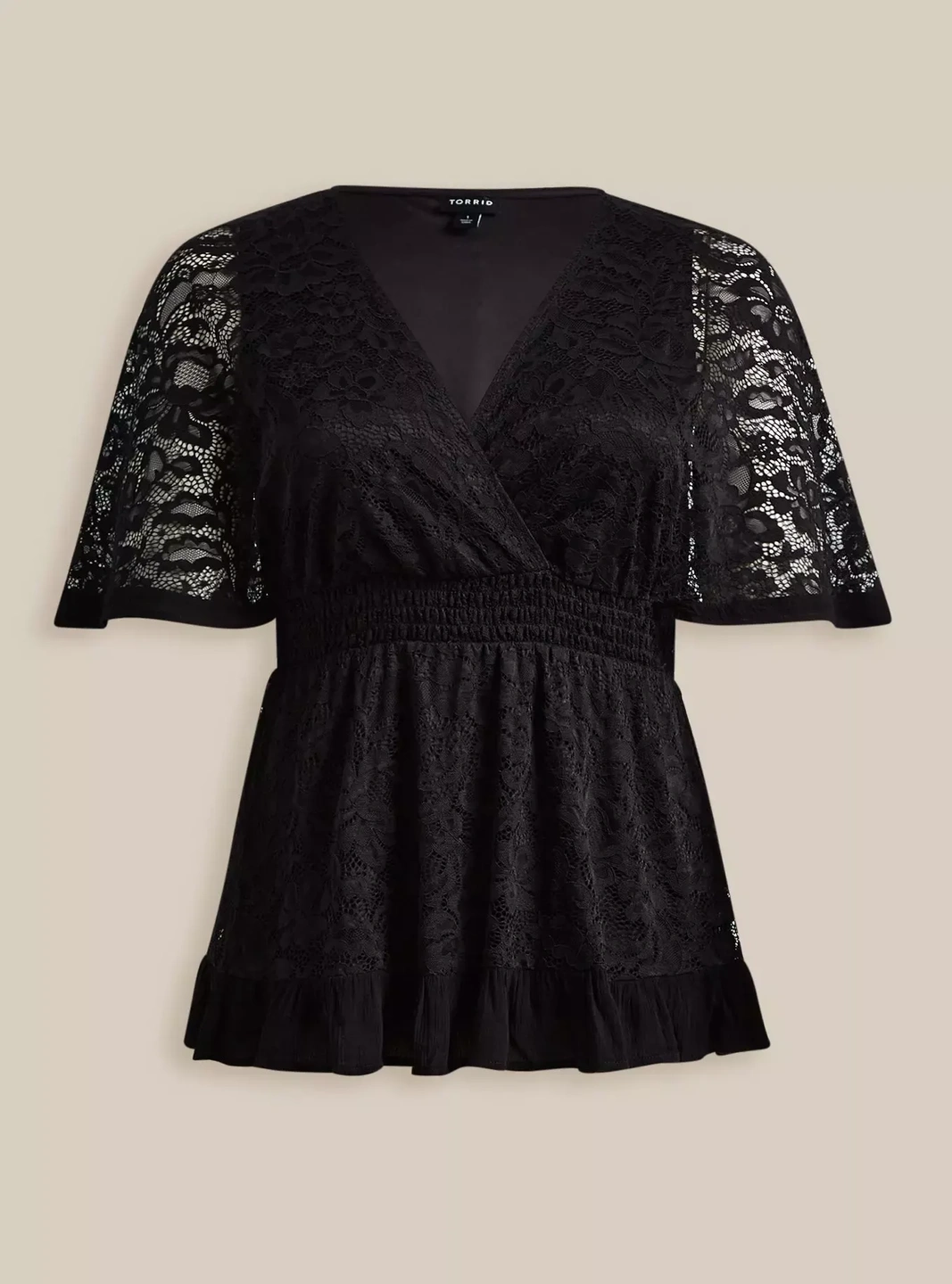 This is a Torrid black lace surplice top. It features a V-neck and short sleeves with lace detailing. Perfect for a night out or a special occasion!