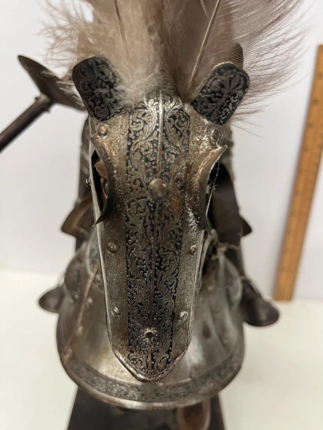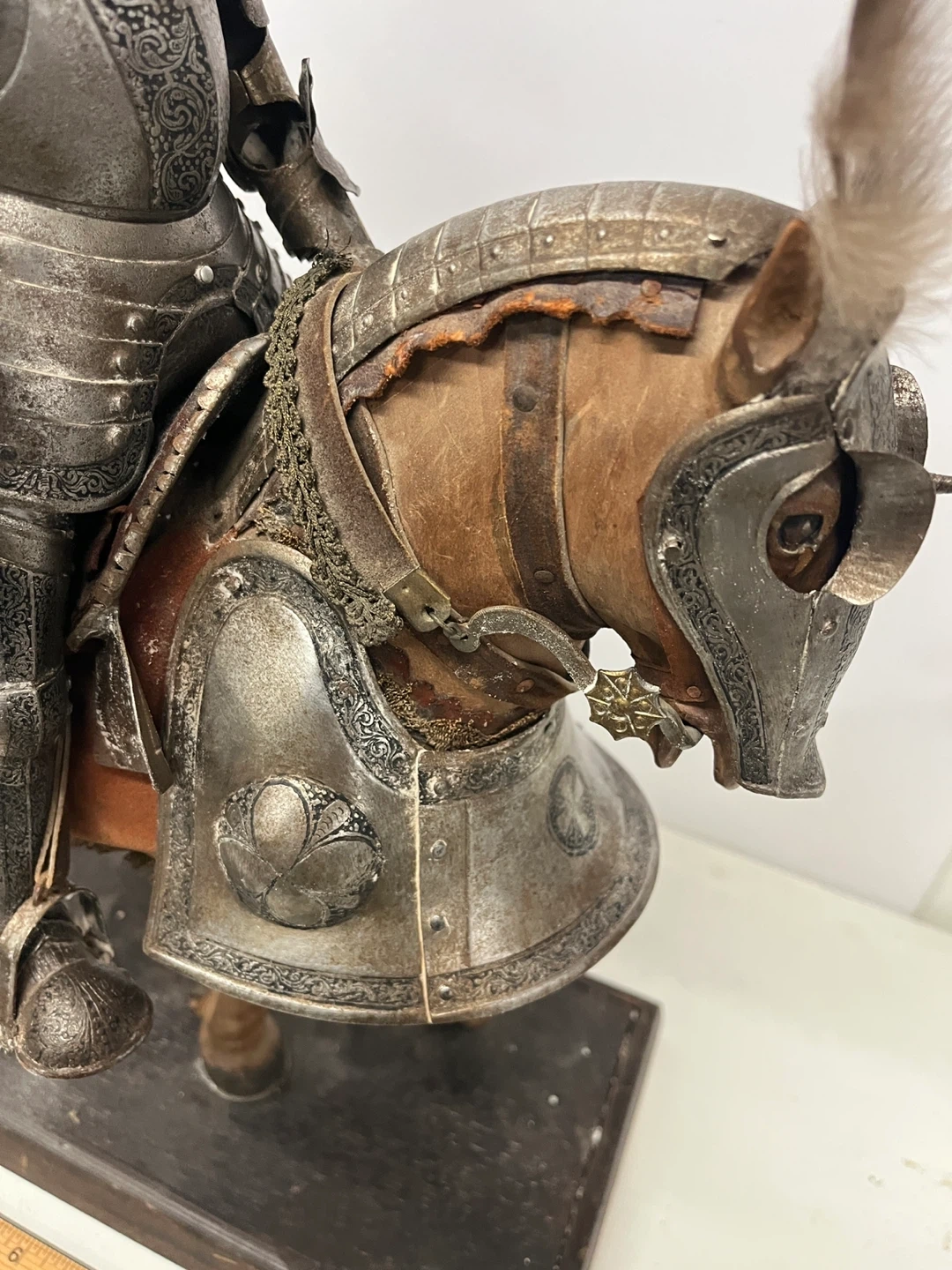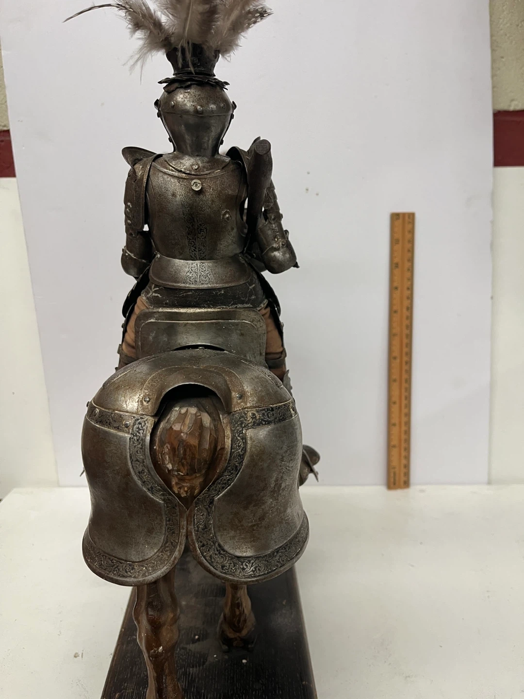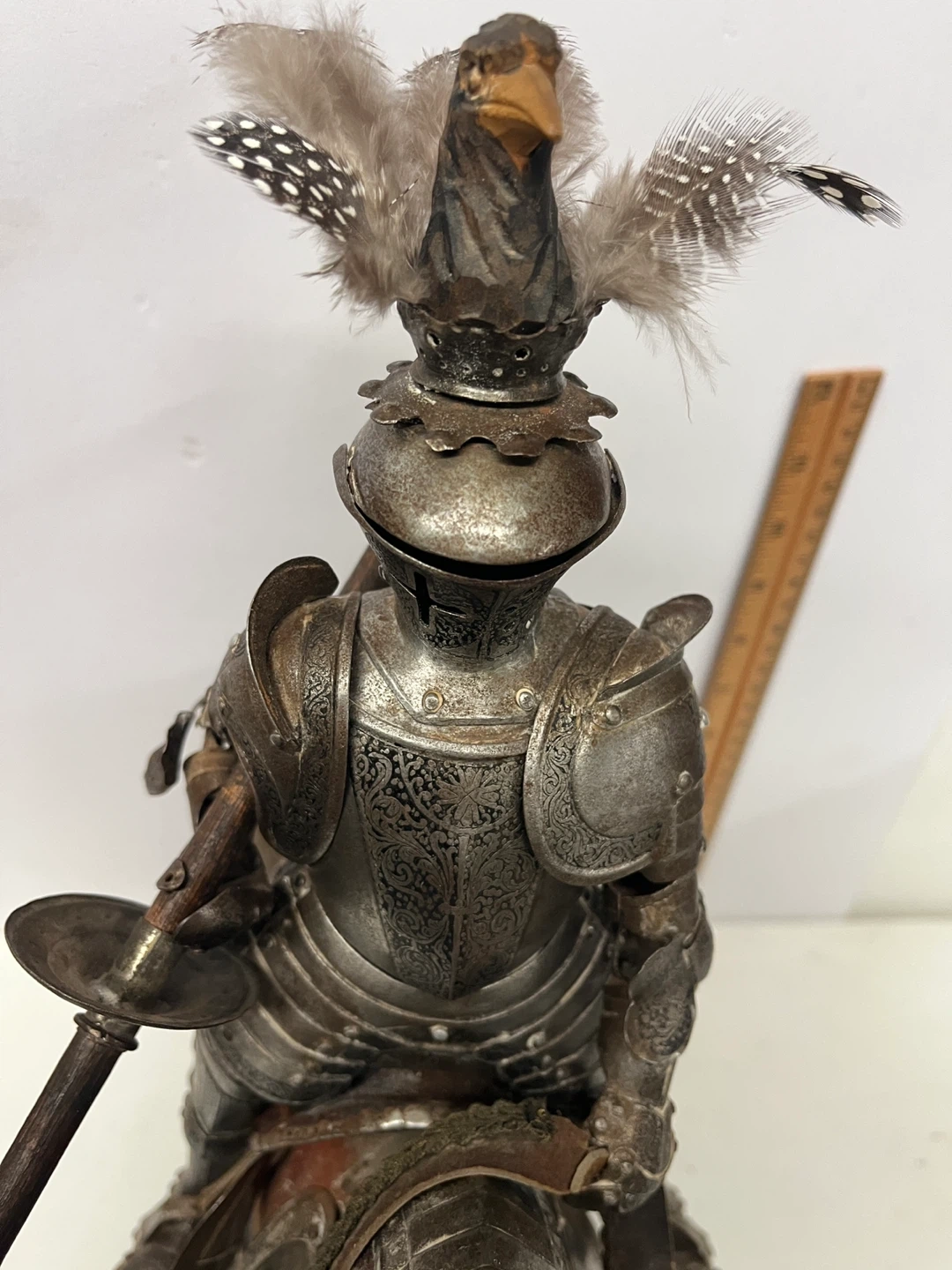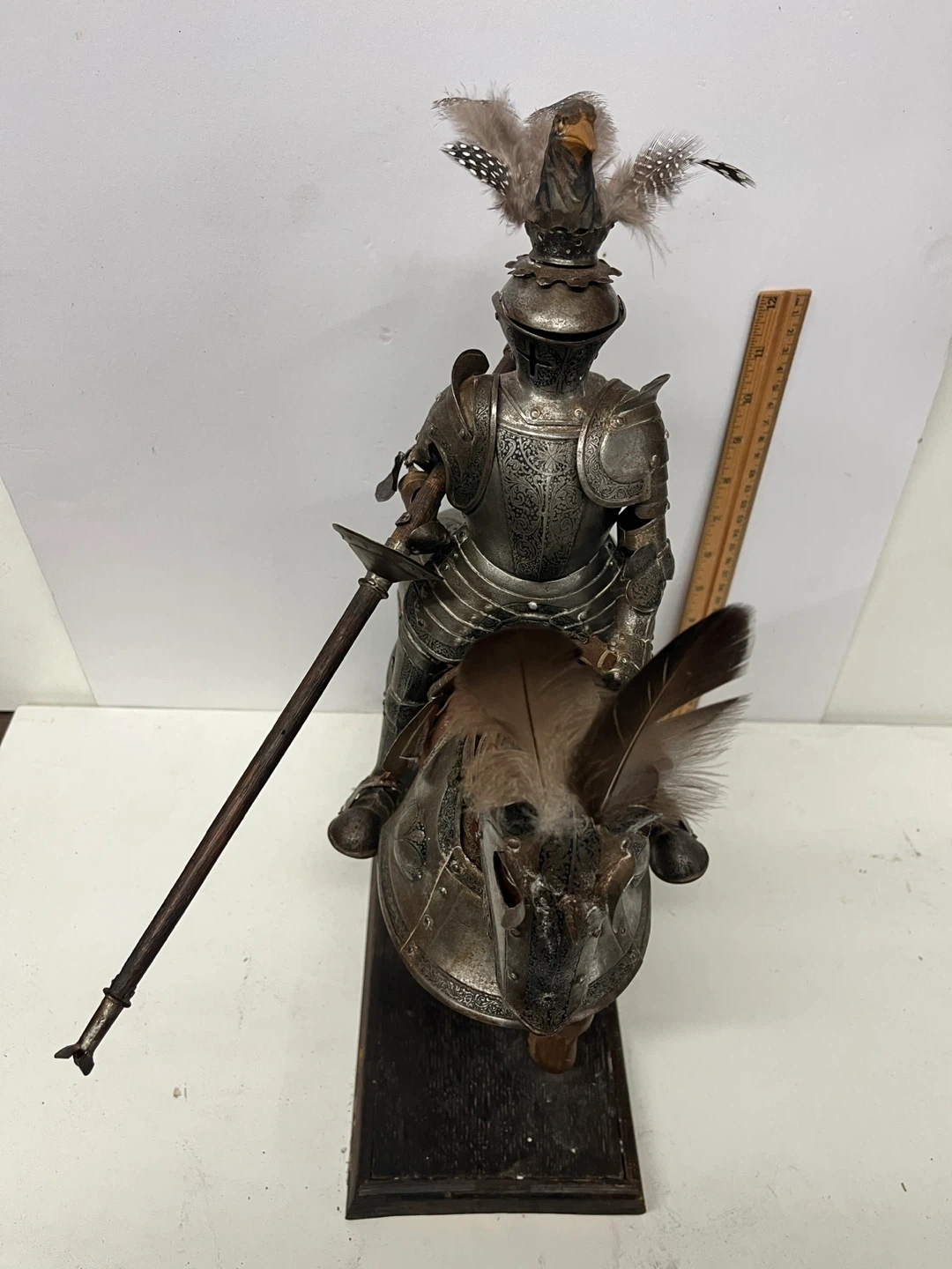 This is a vintage figure of a knight in full armor riding a wooden horse. The detailing on the armor is intricate, with feathers adorning the knight's helmet and the horse's head. It's mounted on a wooden base for display. A fantastic piece for collectors!
