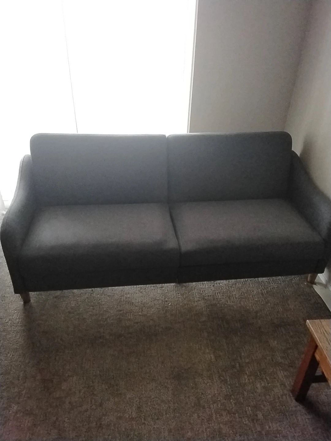 This is a dark grey sofa couch with a modern design. It has clean lines and wooden legs. The couch appears to be a sleeper sofa, with a fold-out bed configuration visible in one of the images.