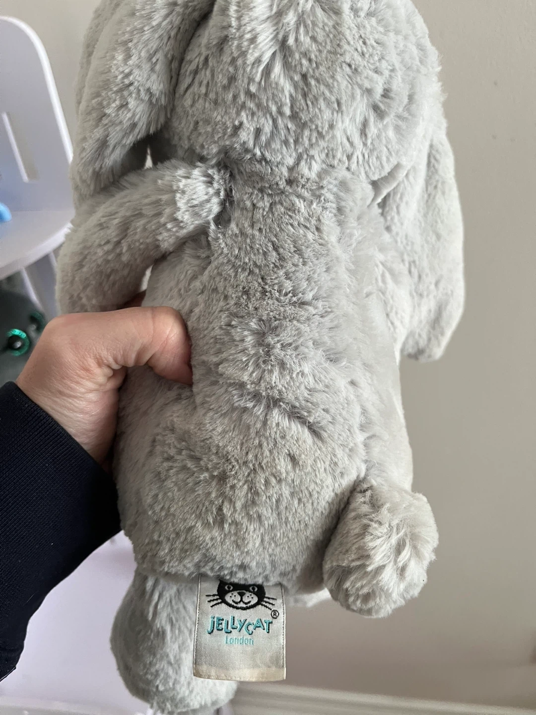 This is a Jellycat Bashful bunny plush toy in a soft grey colour. It's super cuddly and a great size for little hands. Perfect for snuggles!
