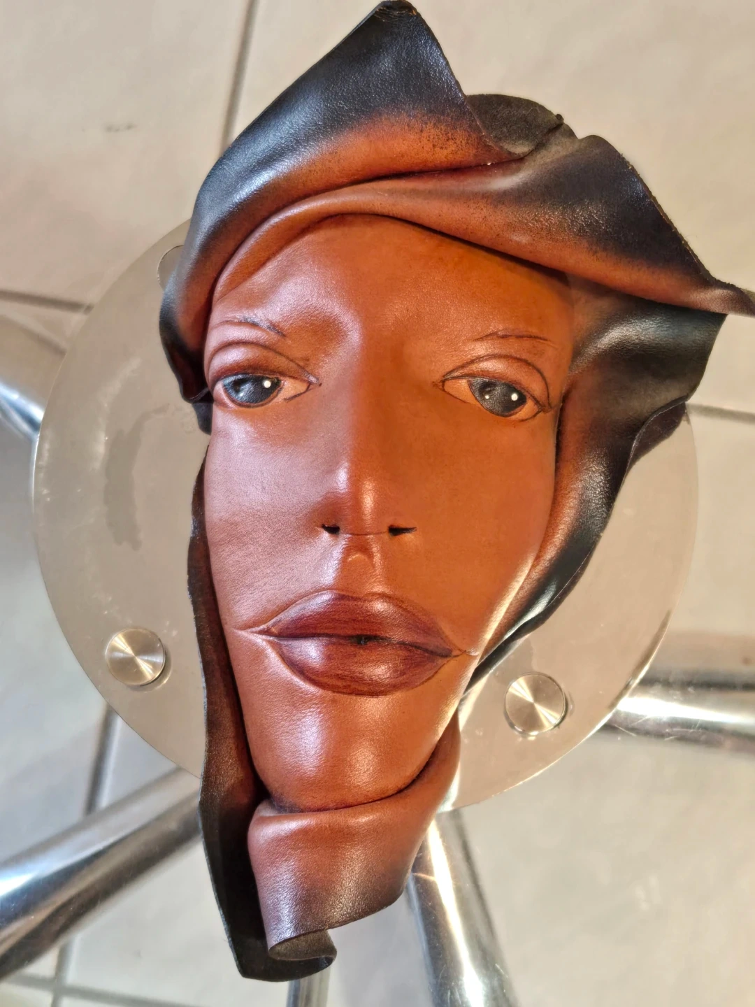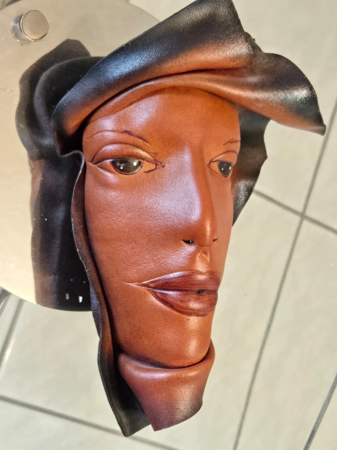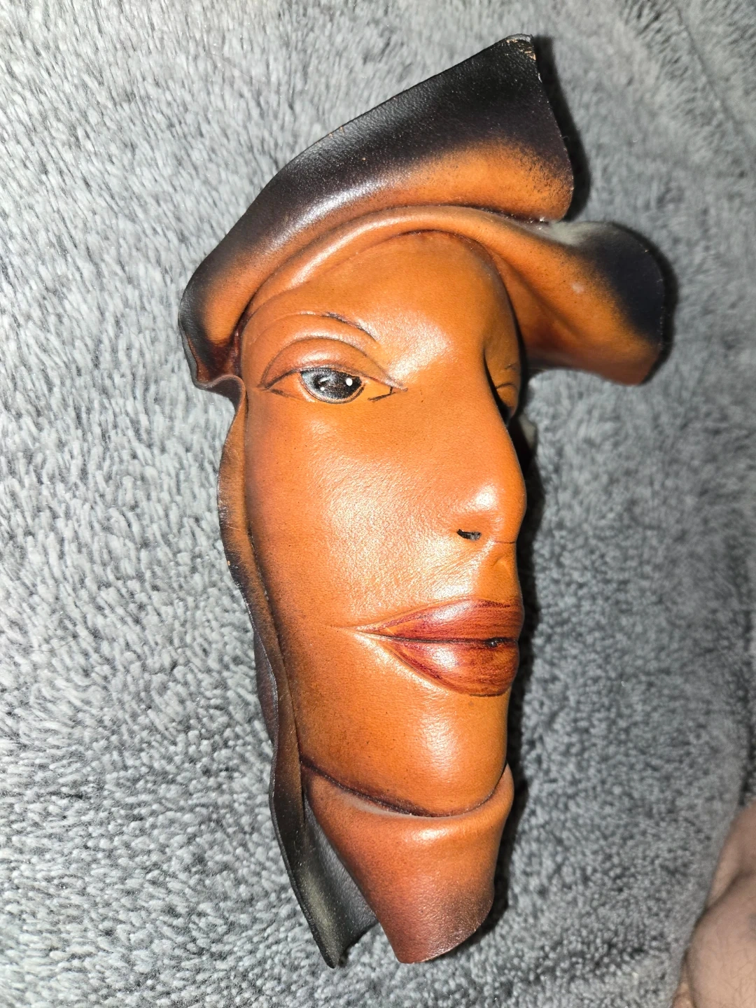 Rare Unique Vintage Doug Gibson 86' Hand Crafted Sculpted Leather Wall Art Lady with Hat handcrafted leather mask. Features a stylized face. Brown and dark brown tones. Could be a wall hanging or decorative accent.