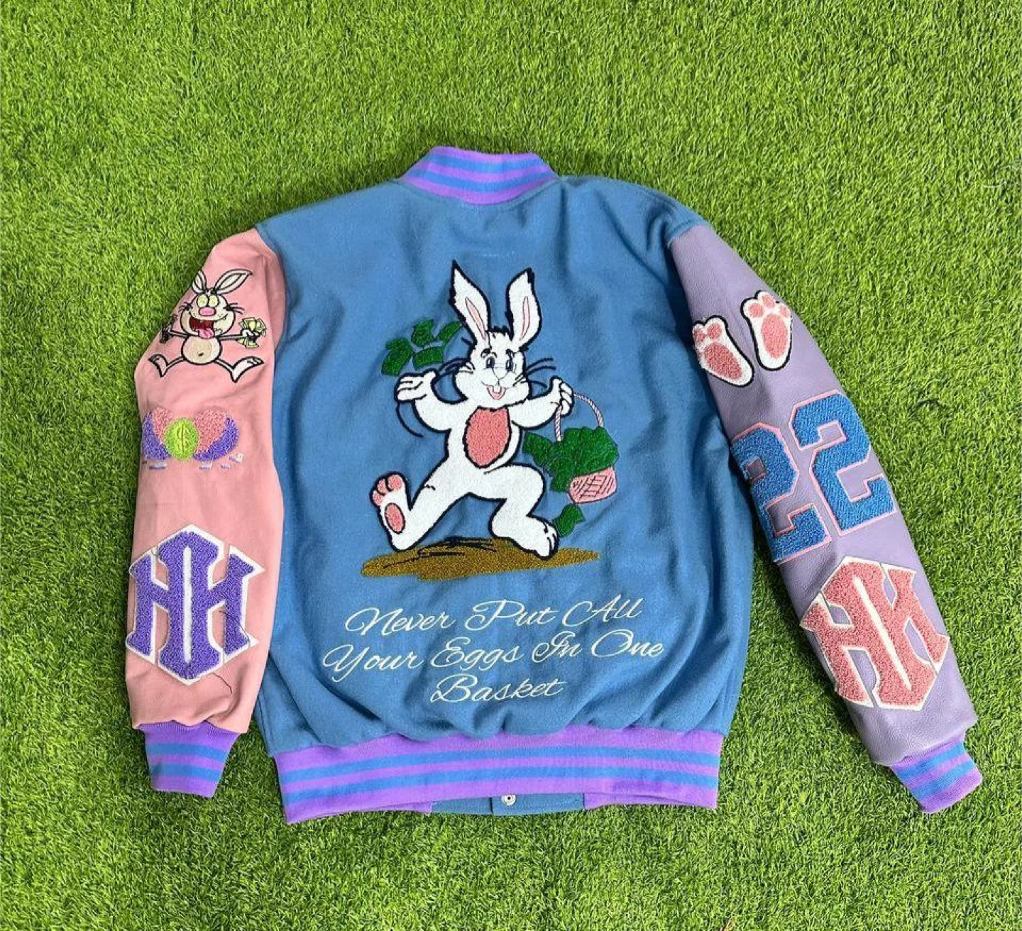 Blue and pink letterman jacket with embroidered bunny graphic and 'Money Bunny' text. Features contrast sleeves with '22' and monogram detailing. Fully lined with a colorful pattern.