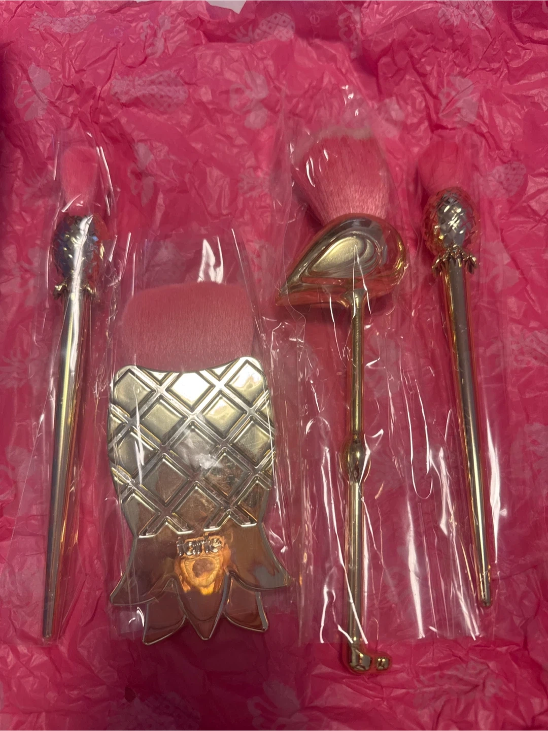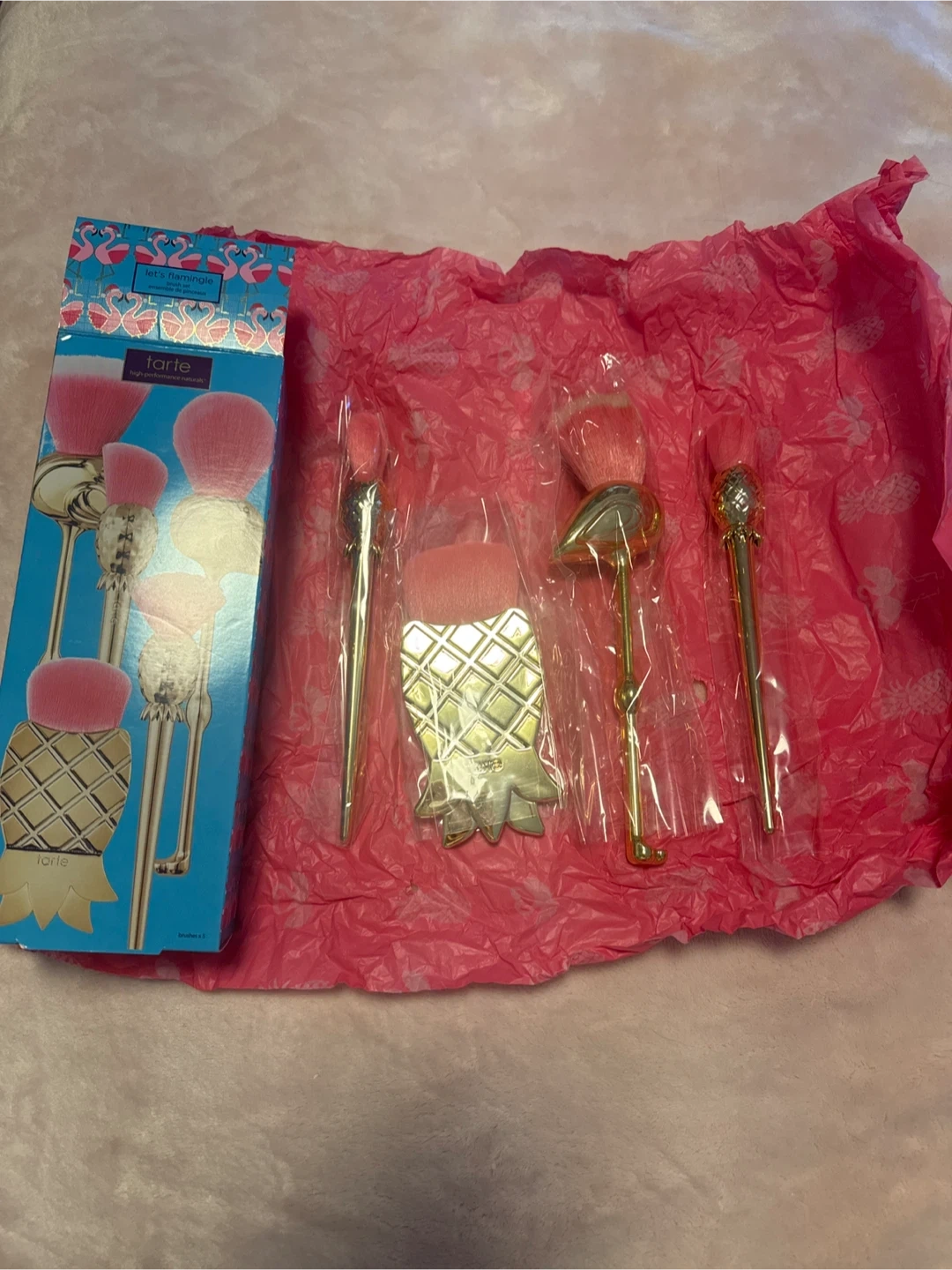 This Tarte makeup brush set features unique pineapple and flamingo designs. It includes several brushes with pink bristles and gold handles. Perfect for adding a fun touch to your makeup routine!
