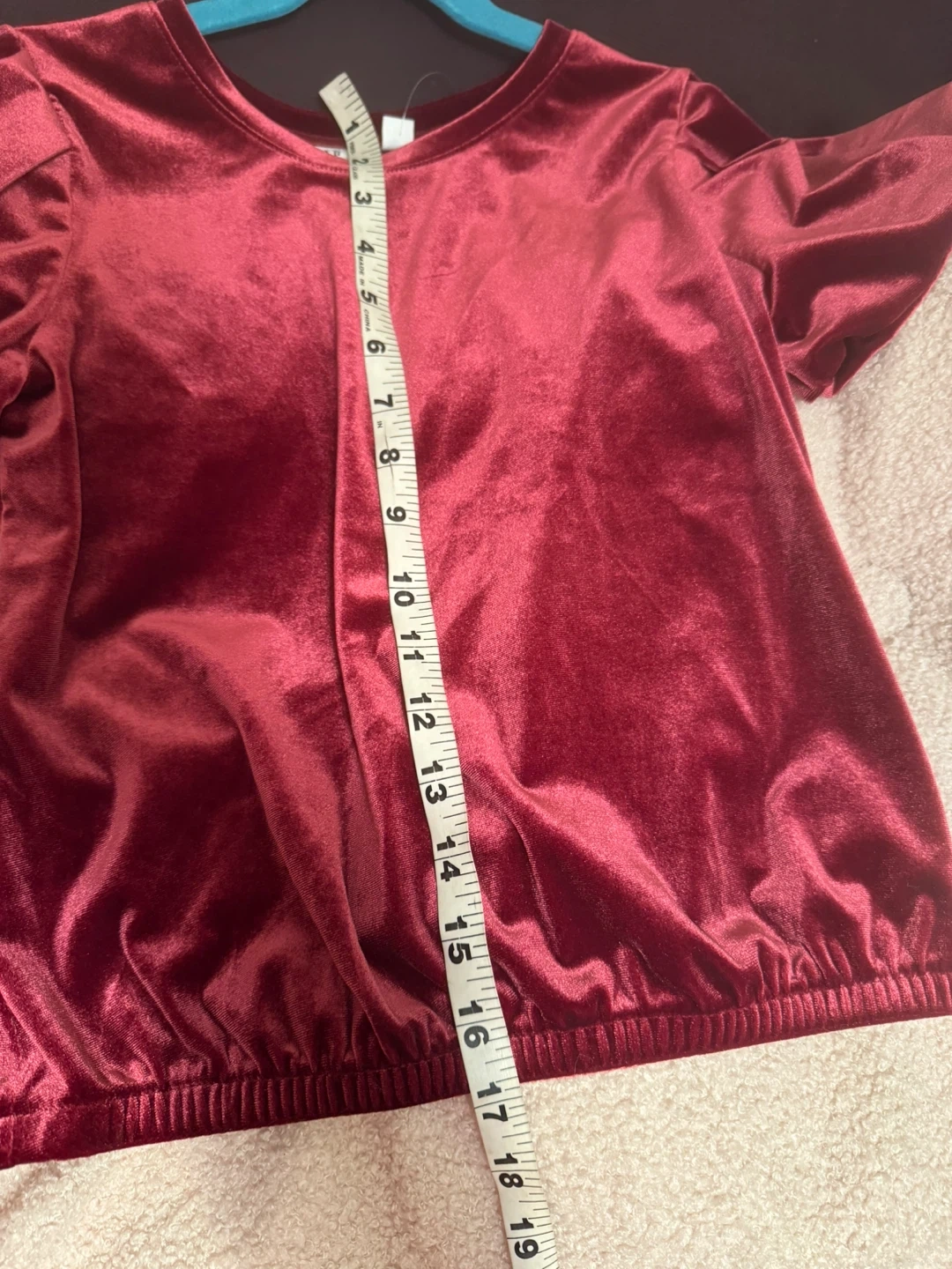 Burgundy velvet top. Puff sleeves. Elastic waistband. Size Medium (8). New with tags.