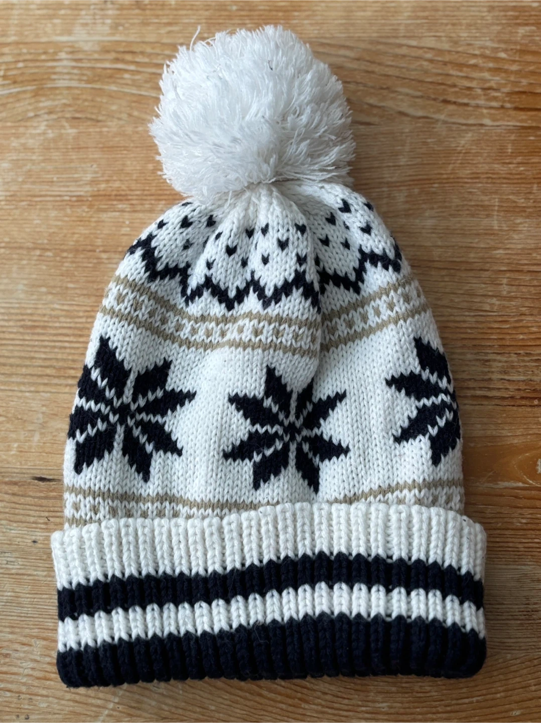 Cozy knit toque featuring a classic snowflake design and a fluffy white pom-pom. It has a ribbed cuff with navy and tan stripes. This toque is made from soft, warm yarn. Perfect for keeping your head warm during chilly weather! I guess this is for anyone that like it.