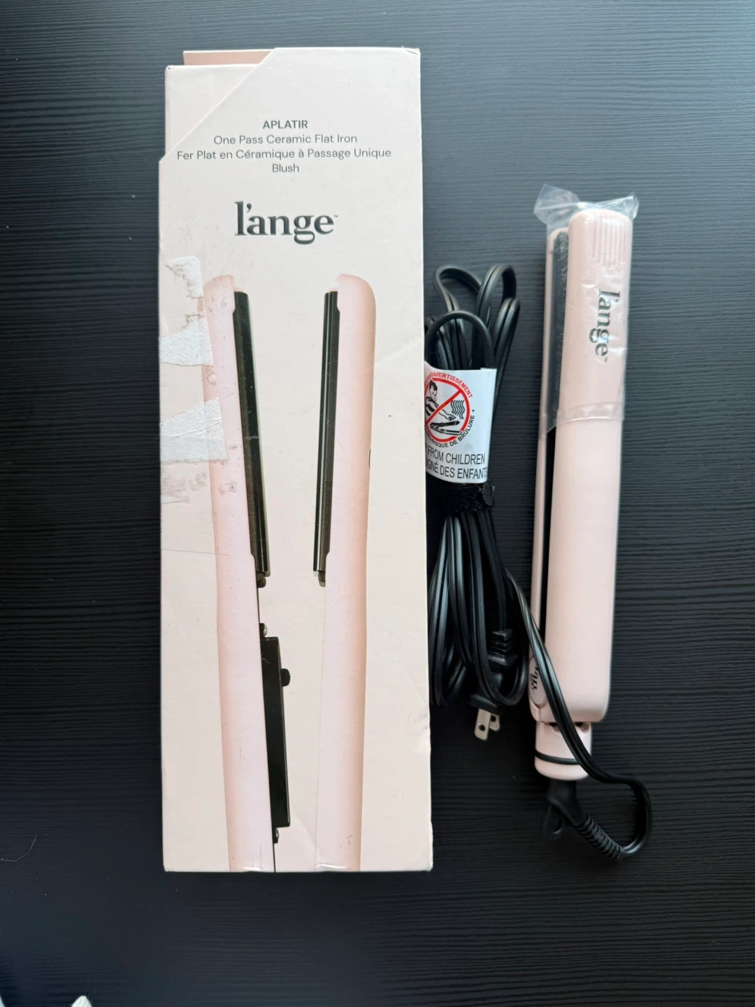 This is a L'ange APLTIR one pass ceramic flat iron in blush. It's 10.23 inches long. Ceramic plates help style hair smoothly.