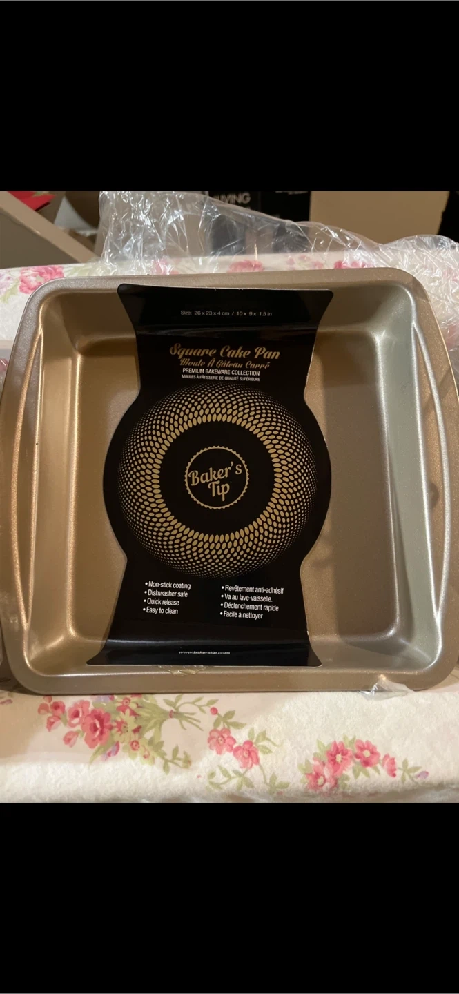 This is a Baker's Tip square cake pan. It's a 10-inch pan with a non-stick coating. It's also easy to clean!