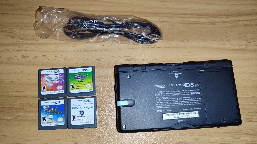 Selling a Nintendo DS Lite in blue. Comes with a charger and four games: Wizards of Waverly Place, iCarly 2, Tinker Bell: Lost Treasure, and Imagine Wedding Designer