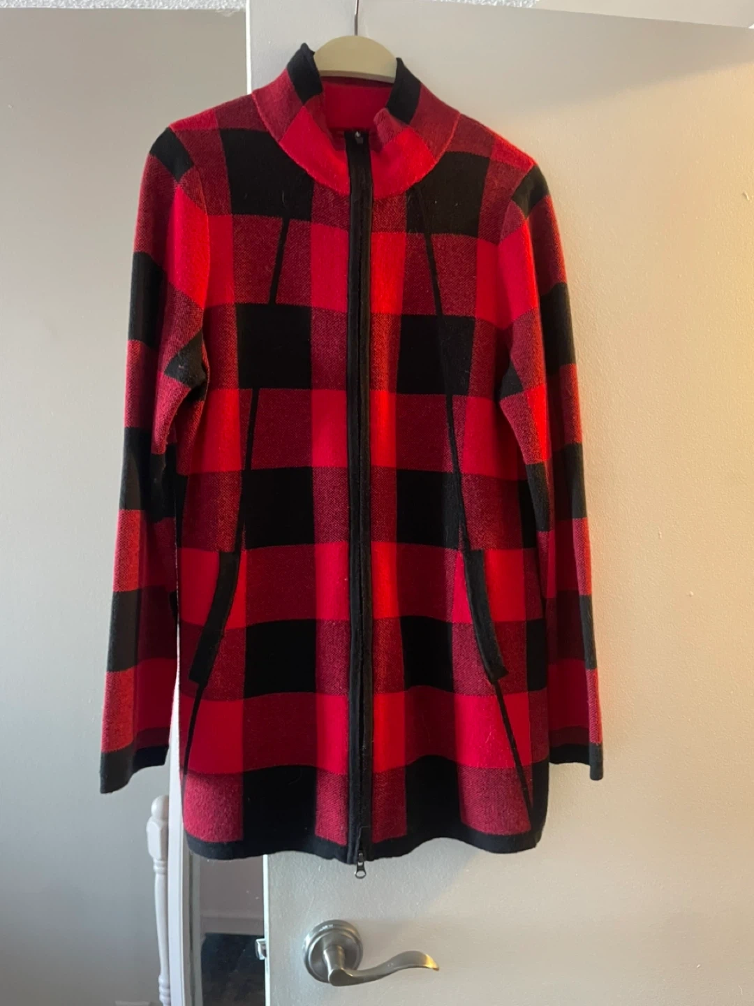This Adrienne Vittadini jacket features a red and black buffalo plaid pattern. It's a zip-up style with a stand-up collar. Size is large. Long but not bulky. Pockets. A nice lightweight sweater jacket. Good used condition.