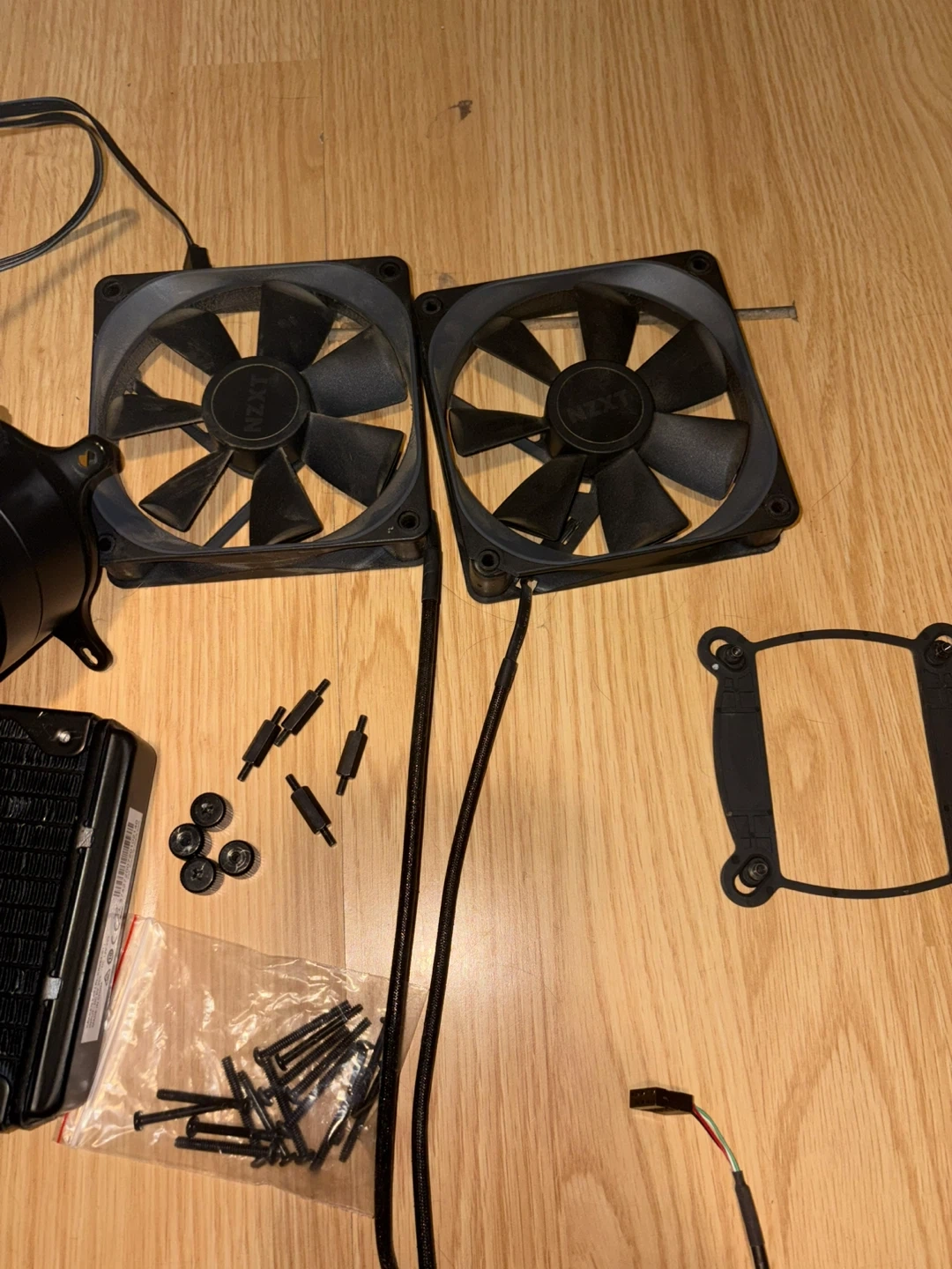 This is an NZXT Kraken X53 all-in-one liquid cooler. It includes two 120mm fans and all necessary mounting hardware. This cooler is black and has RGB lighting capabilities. It's great for keeping your CPU temps low!