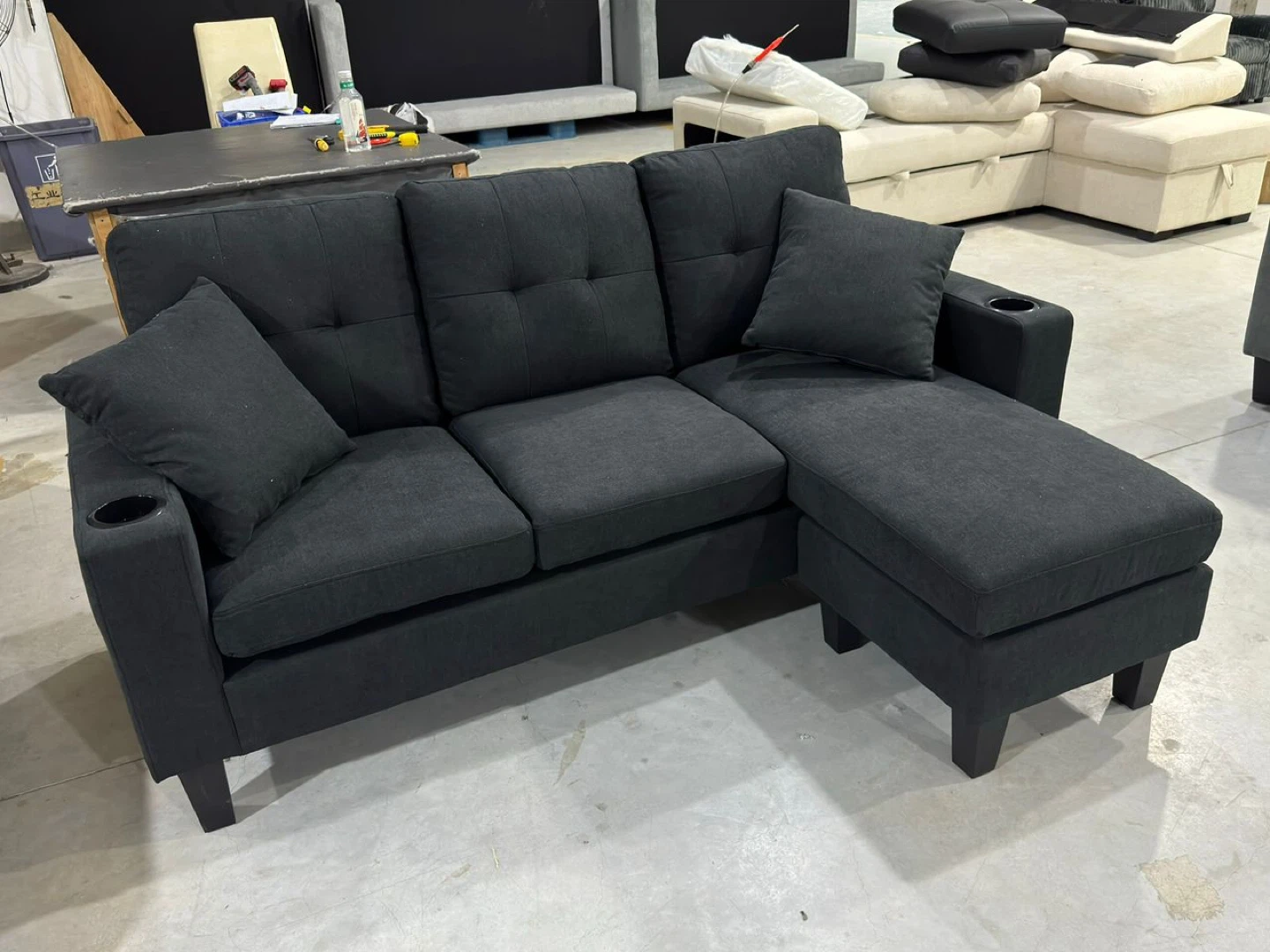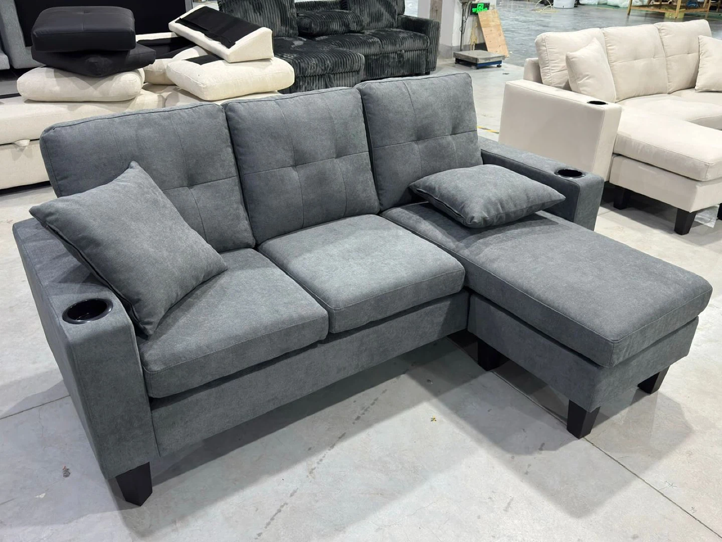 Dark grey fabric sectional sofa with two toss pillows and two built-in cup holders. It's a three-seater with a chaise on one side. Tufted seat cushions and backrest. Comes with an additional small throw pillow.