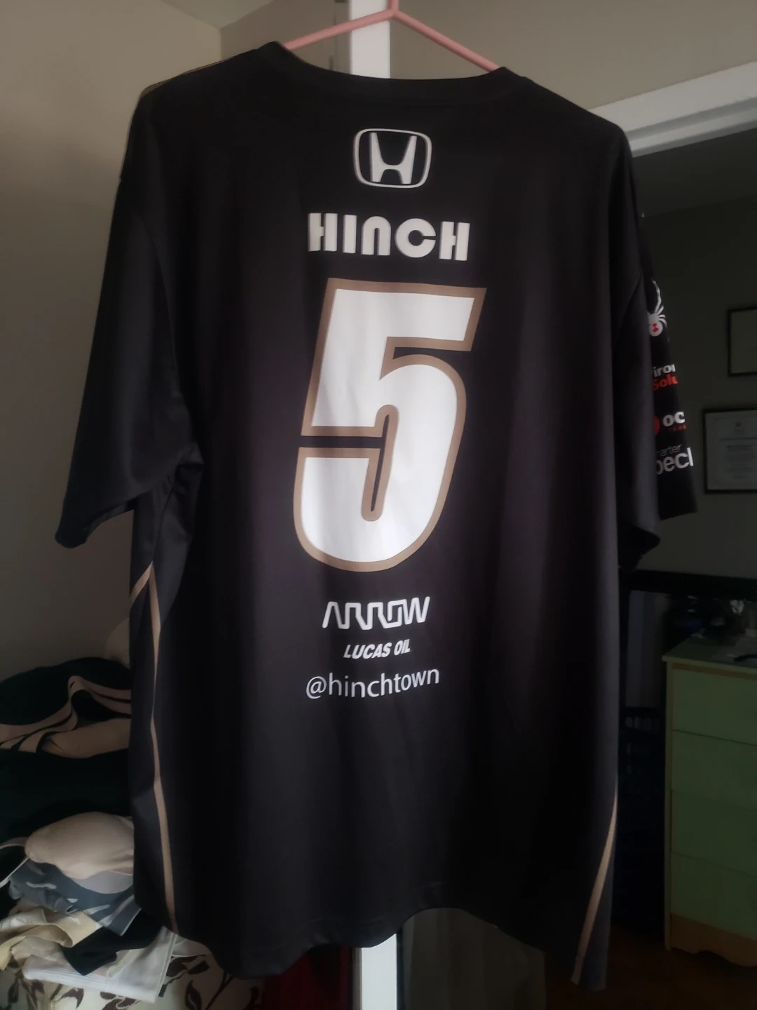 This is a Honda Hinch 5 Verizon IndyCar Series t-shirt. It's black with gold accents and features multiple sponsor logos. Made for race fans!