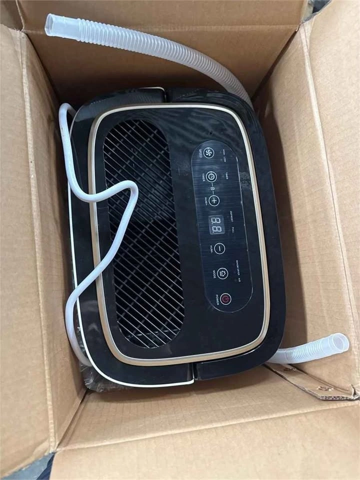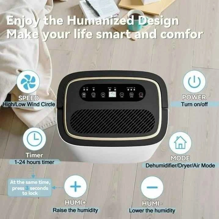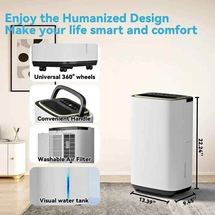 Powerful dehumidifier. 50 pint capacity, good for up to 5000 sq ft. Features 360-degree wheels and a convenient handle for easy moving. Includes a washable air filter, a visual water tank to see the water level, and a continuous drain hose. Set the timer for 1-24 hours and control humidity levels. Modes include dehumidifying, drying, or just air circulation. Measures approximately 22.24" H x 13.39" W x 9.45" D.