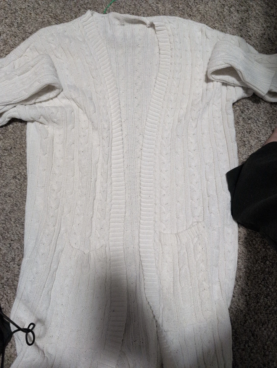 Cream cable knit long cardigan. It has two front pockets and a relaxed fit. Perfect for layering over outfits. At least a 2x