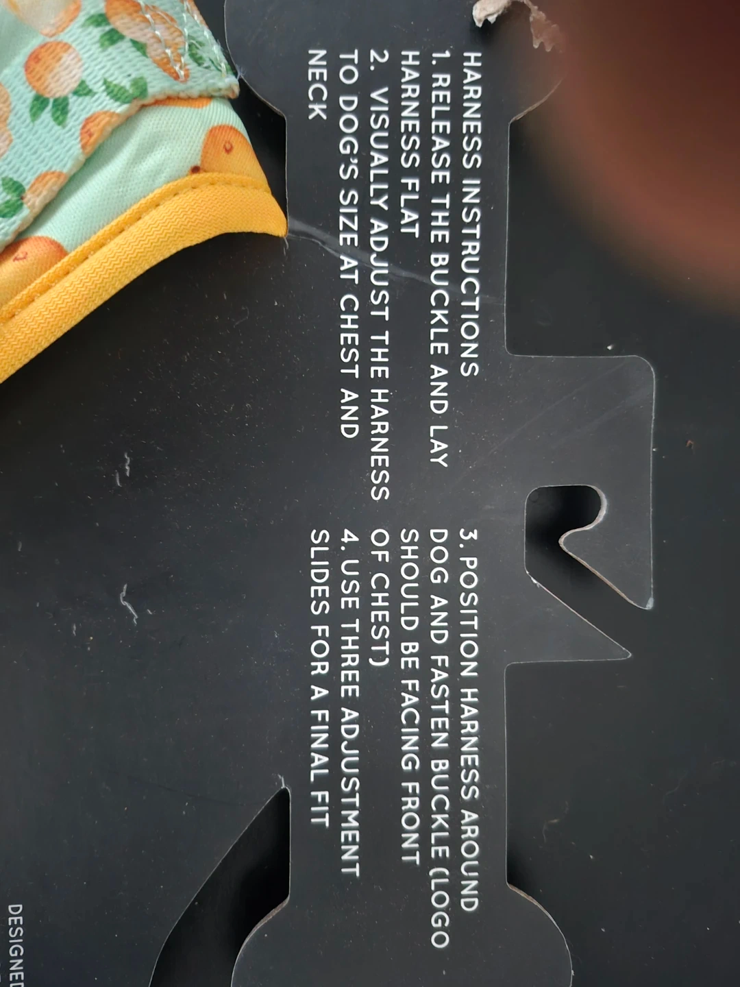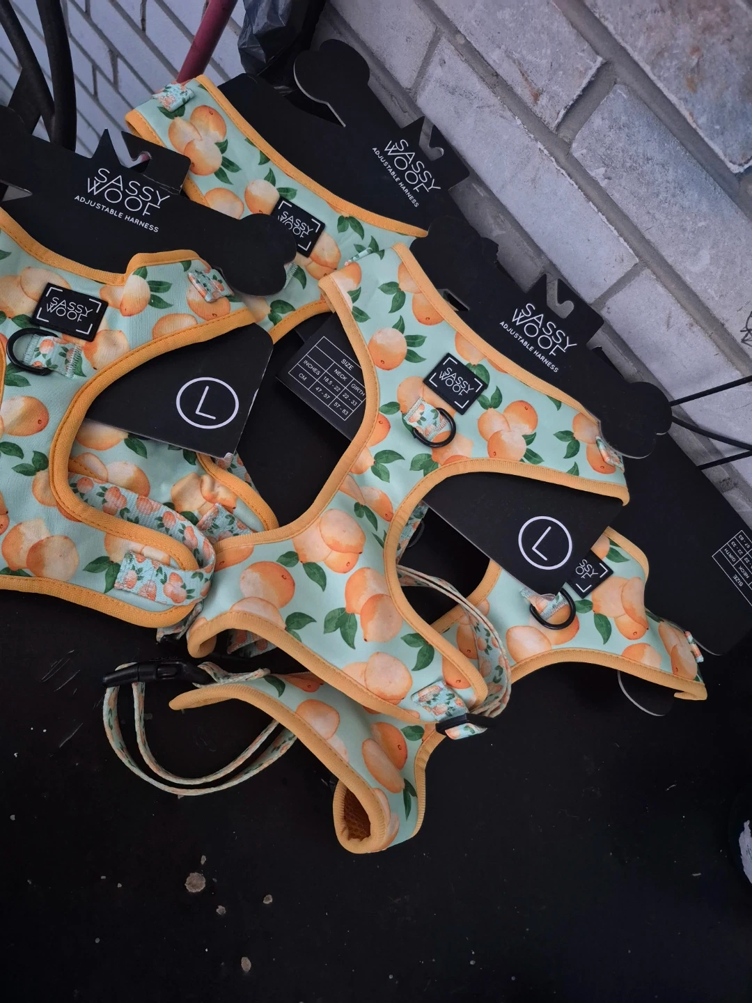 This Sassy Woof adjustable harness features a cute peach print. It's designed for a neck size of 16.5-22 inches and a girth of 22-33 inches. It offers three adjustment slides for a final fit.
