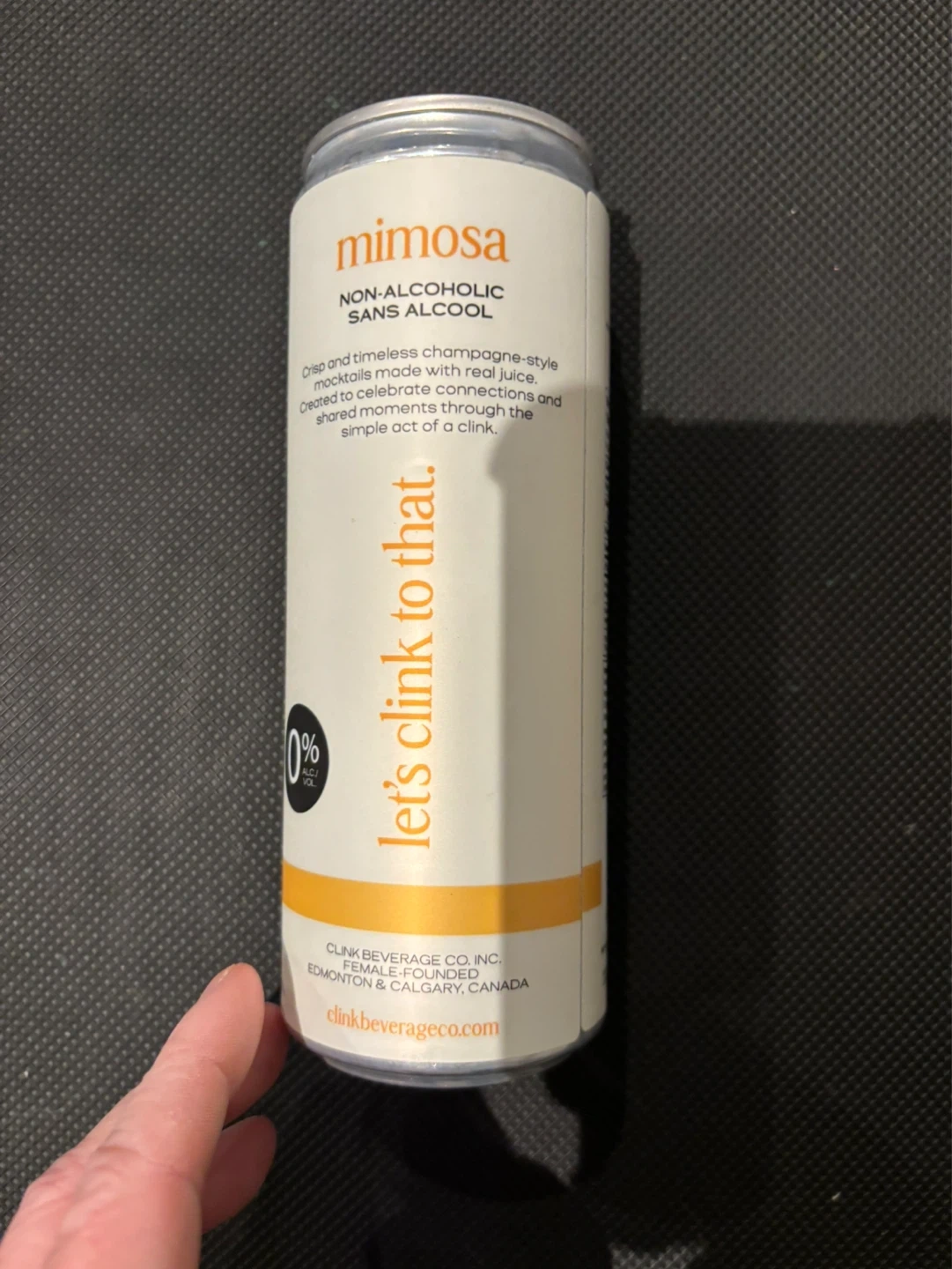 Two cans of Clink Beverage Co. Mimosa Bubbly Brut Mocktail. Non-alcoholic, 0% ABV. Made with real juice. 355 ml / 12 fl. oz. each. Perfect for celebrations or when you want a crisp mocktail!