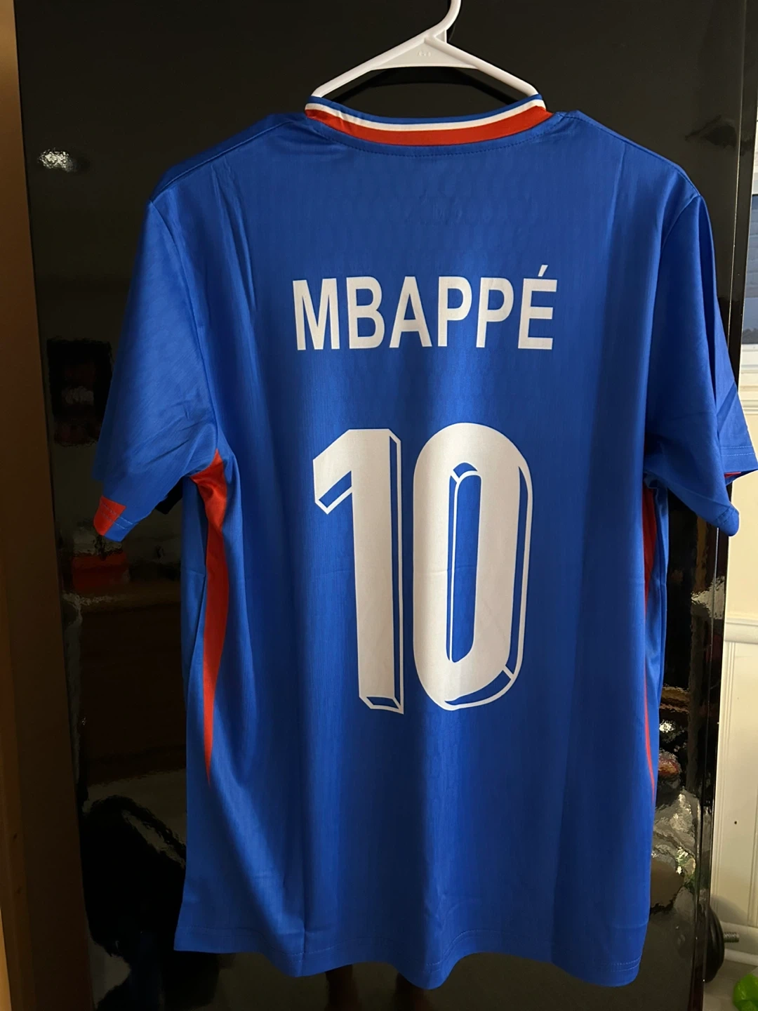 This is a Nike France National Football Team jersey with Mbappé and the number 10 printed on the back. It's made with DRI-FIT technology. This jersey is great for any soccer fan!