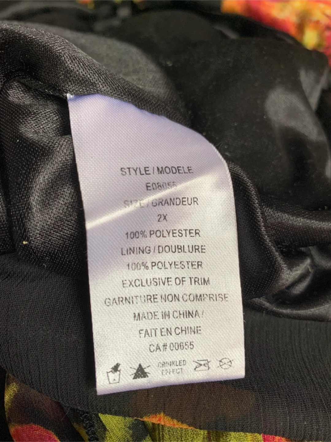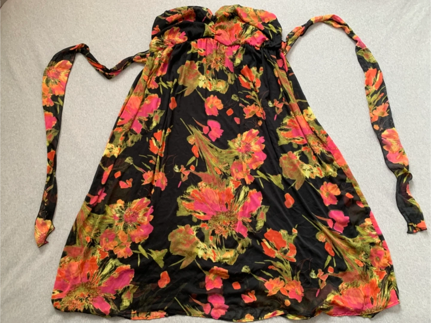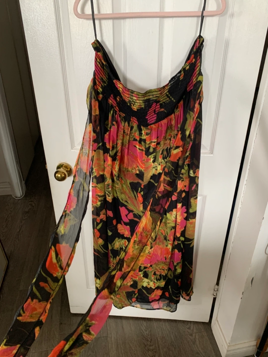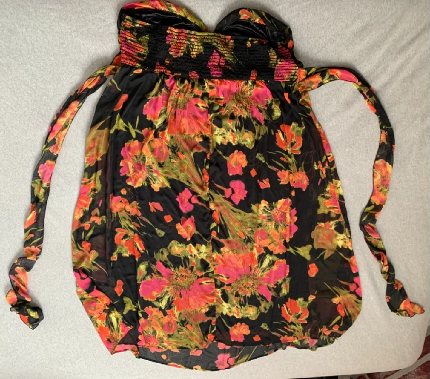 A vibrant floral print (poppies?). It has a smocked bodice and the 2 fun fabric pieces to tie/halter. The garment is fairly lightweight and flowy with lovely layers.