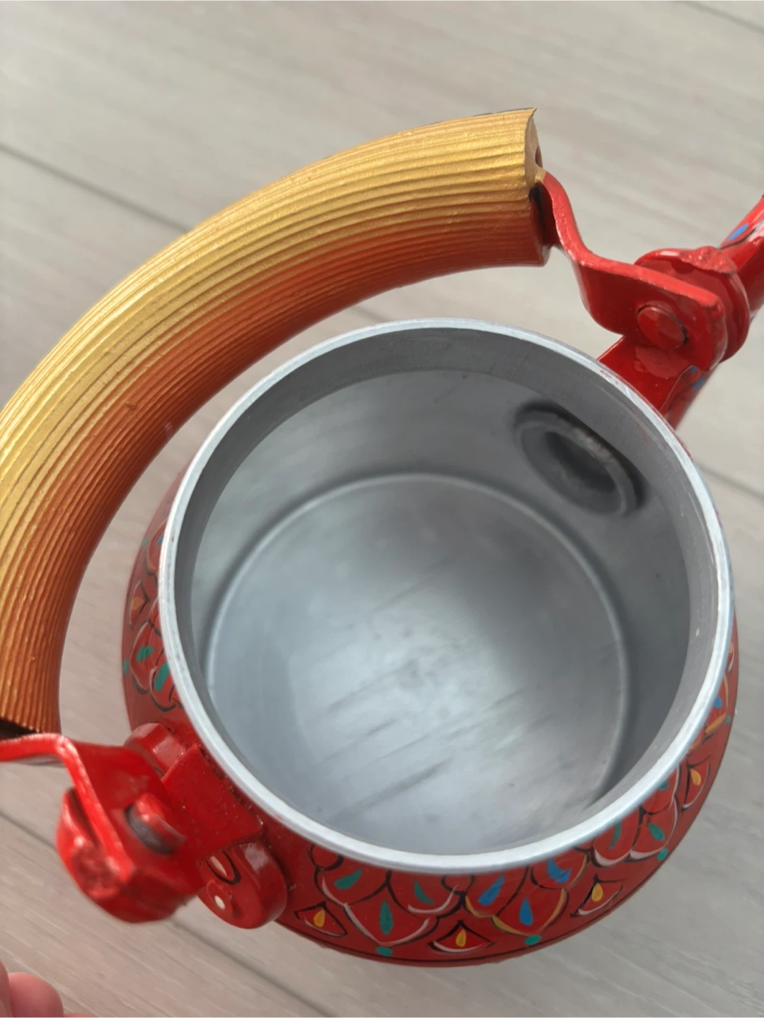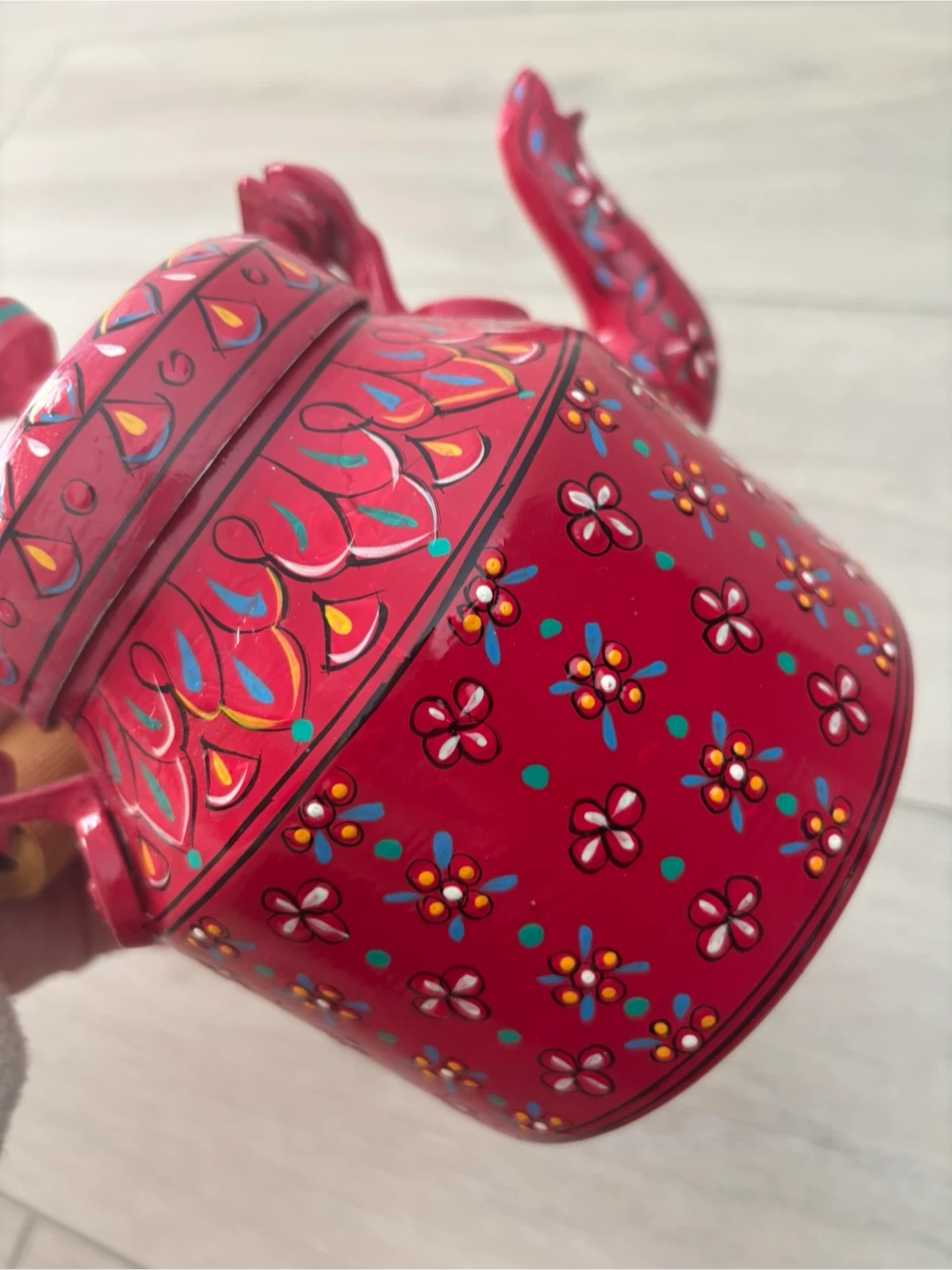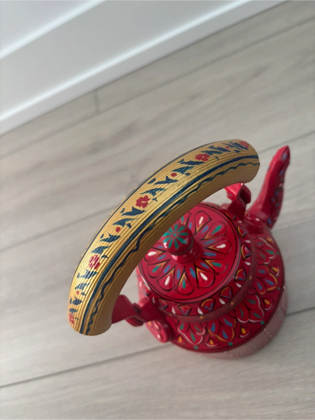 A beautifully hand-painted red tea kettle with a decorative wooden handle. It features intricate floral and patterned designs. This kettle is perfect for adding a unique, colourful touch to your kitchen.