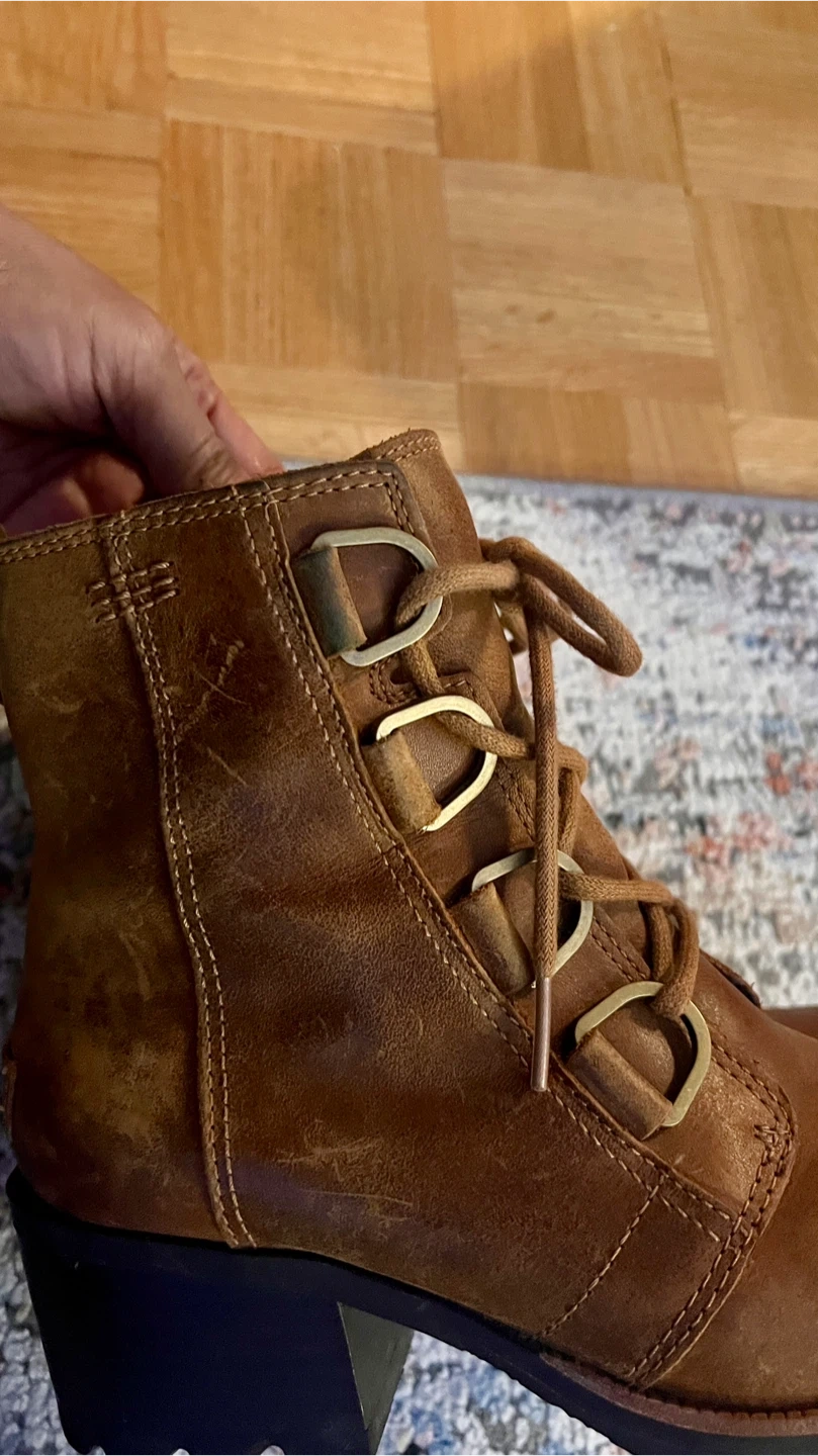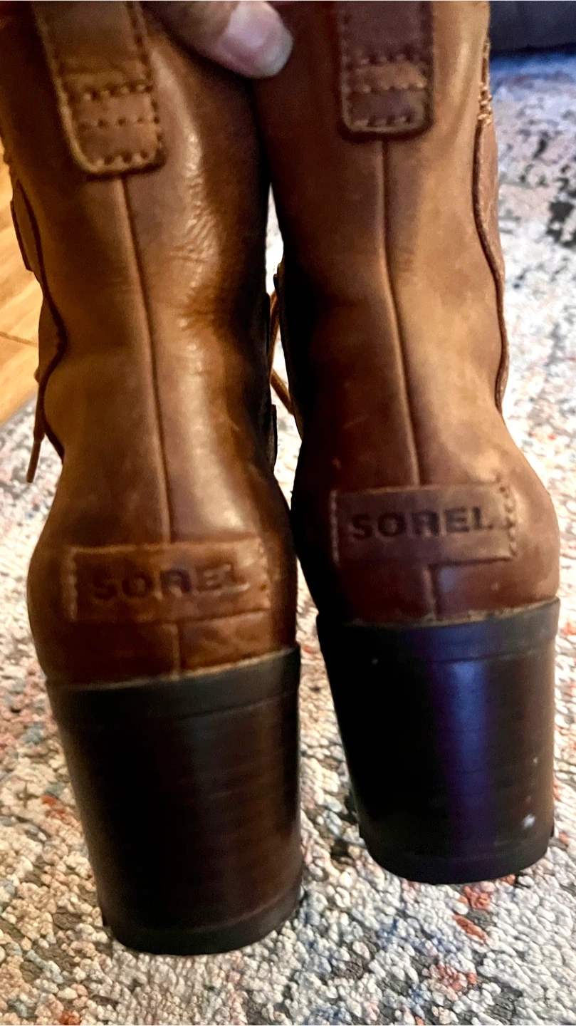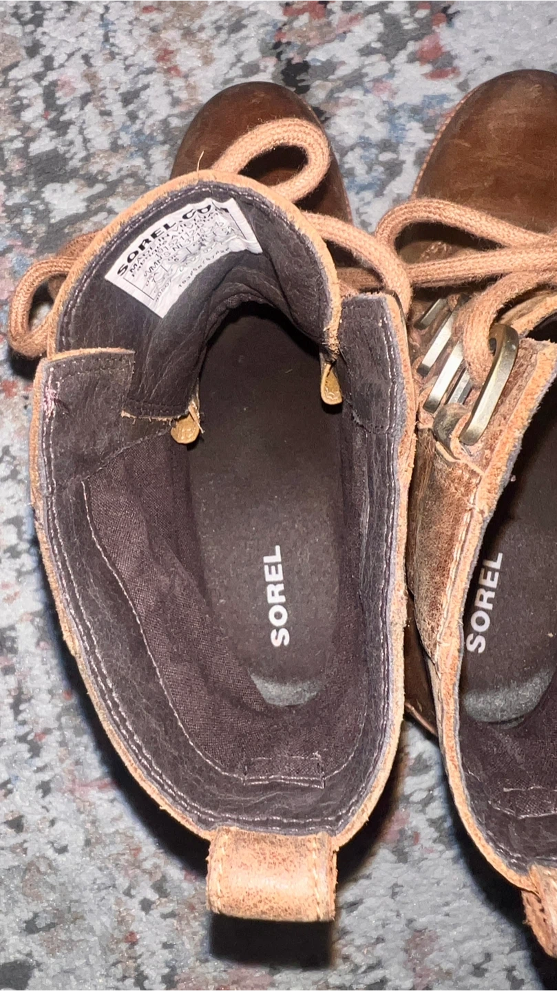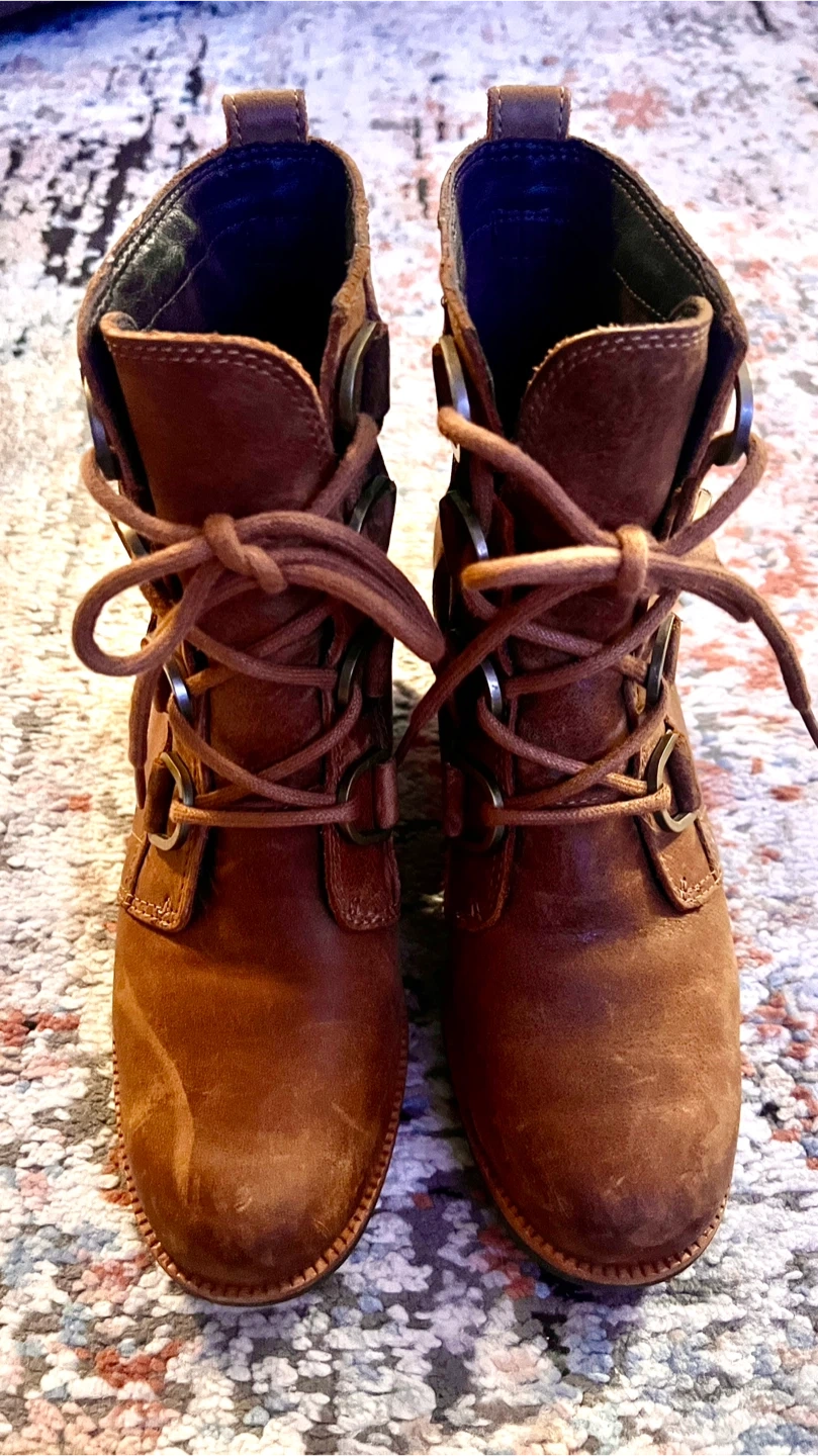 These preloved Sorel ankle boots are made of brown leather with a lace-up front. They feature a block heel and decorative hardware. Size 7 USA, 5 UK, 38 EUR, 24 CM.