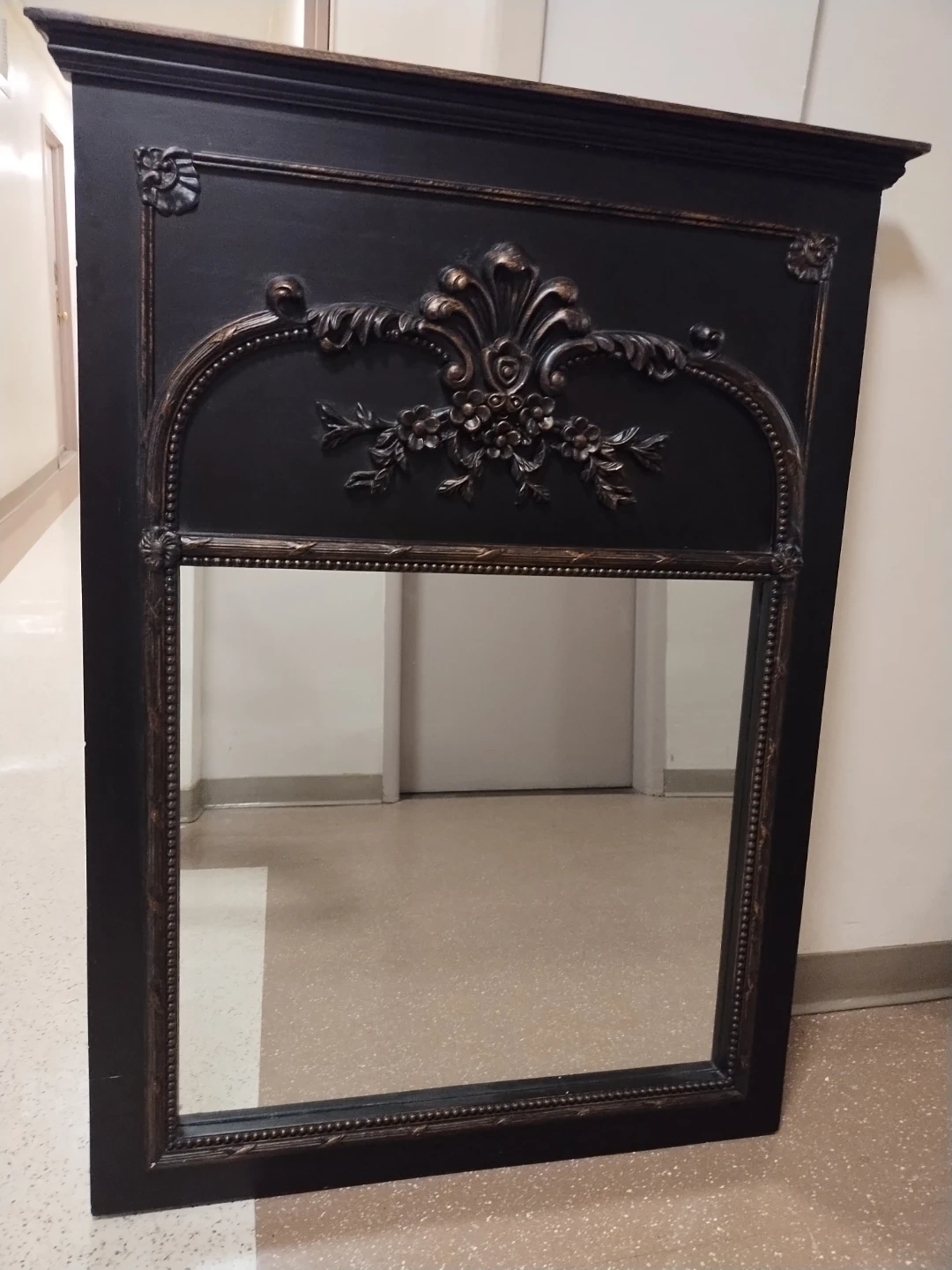 This is an ornate black wall mirror with a decorative arch top. It features a detailed frame with raised floral and scroll accents. The frame has a distressed bronze finish on the decorative elements. It's a beautiful statement piece for any room!