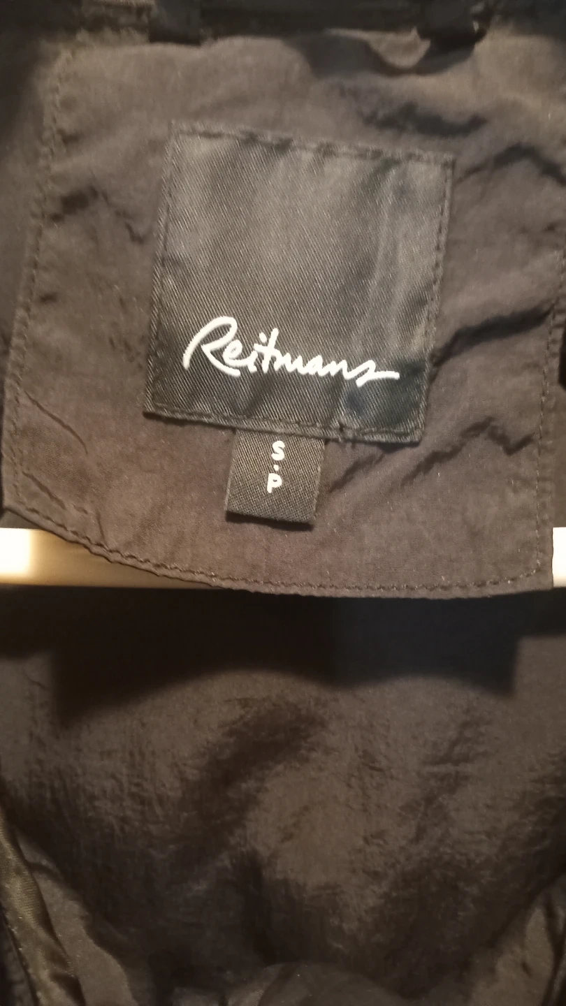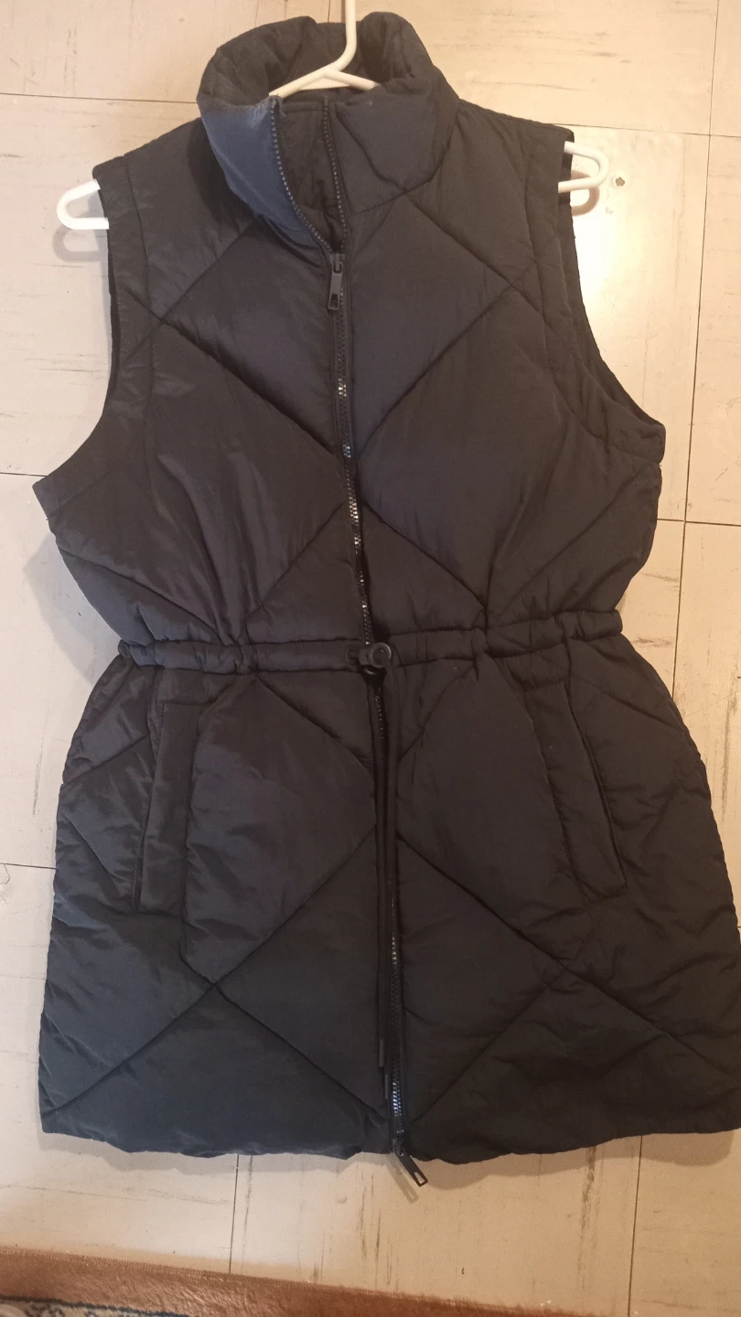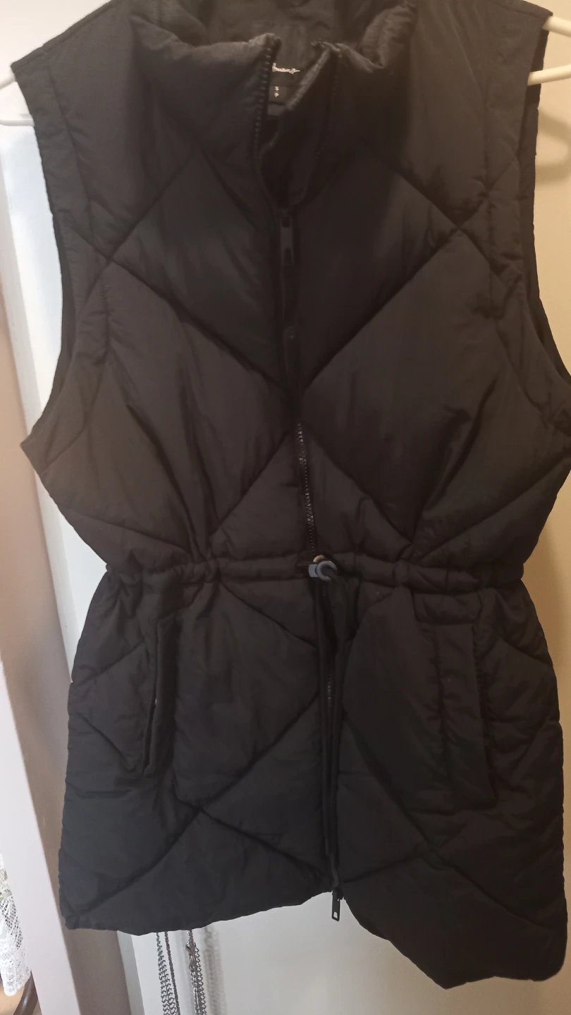 Black puffer vest with a cinched waist and full zip closure. It has two front pockets. Material is polyester.