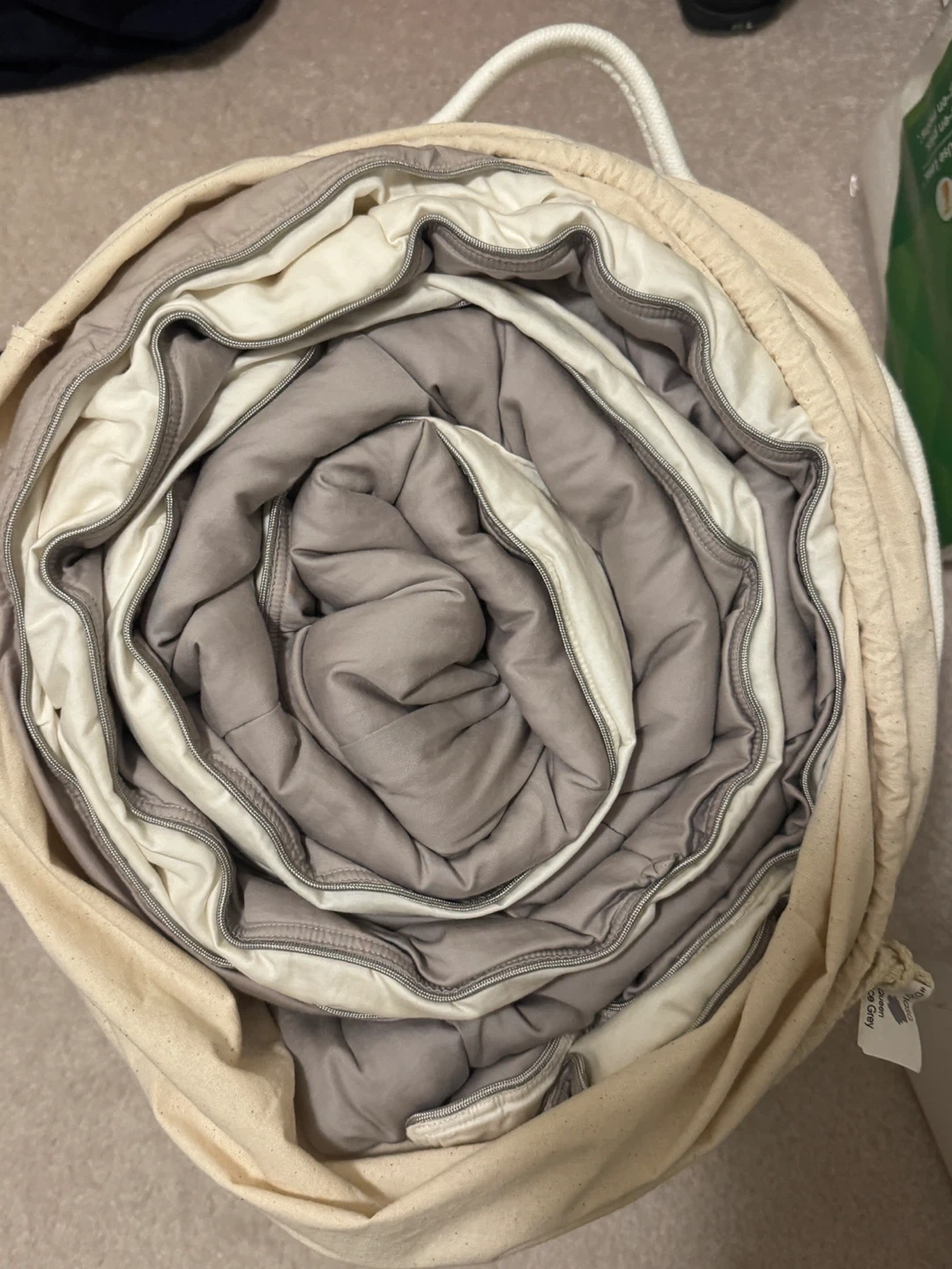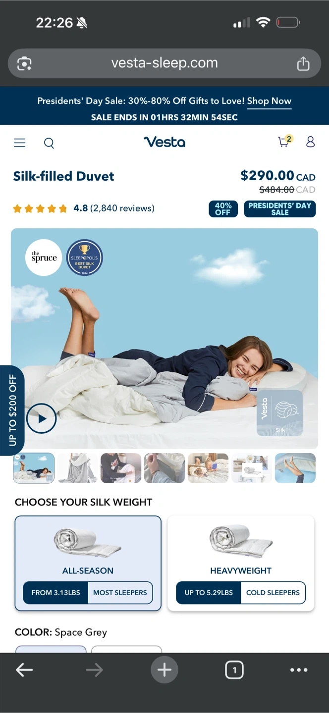 Vesta silk-filled duvet in Queen size, Space Grey colour. It's a heavyweight option, suitable for cold sleepers. Comes with a storage bag.