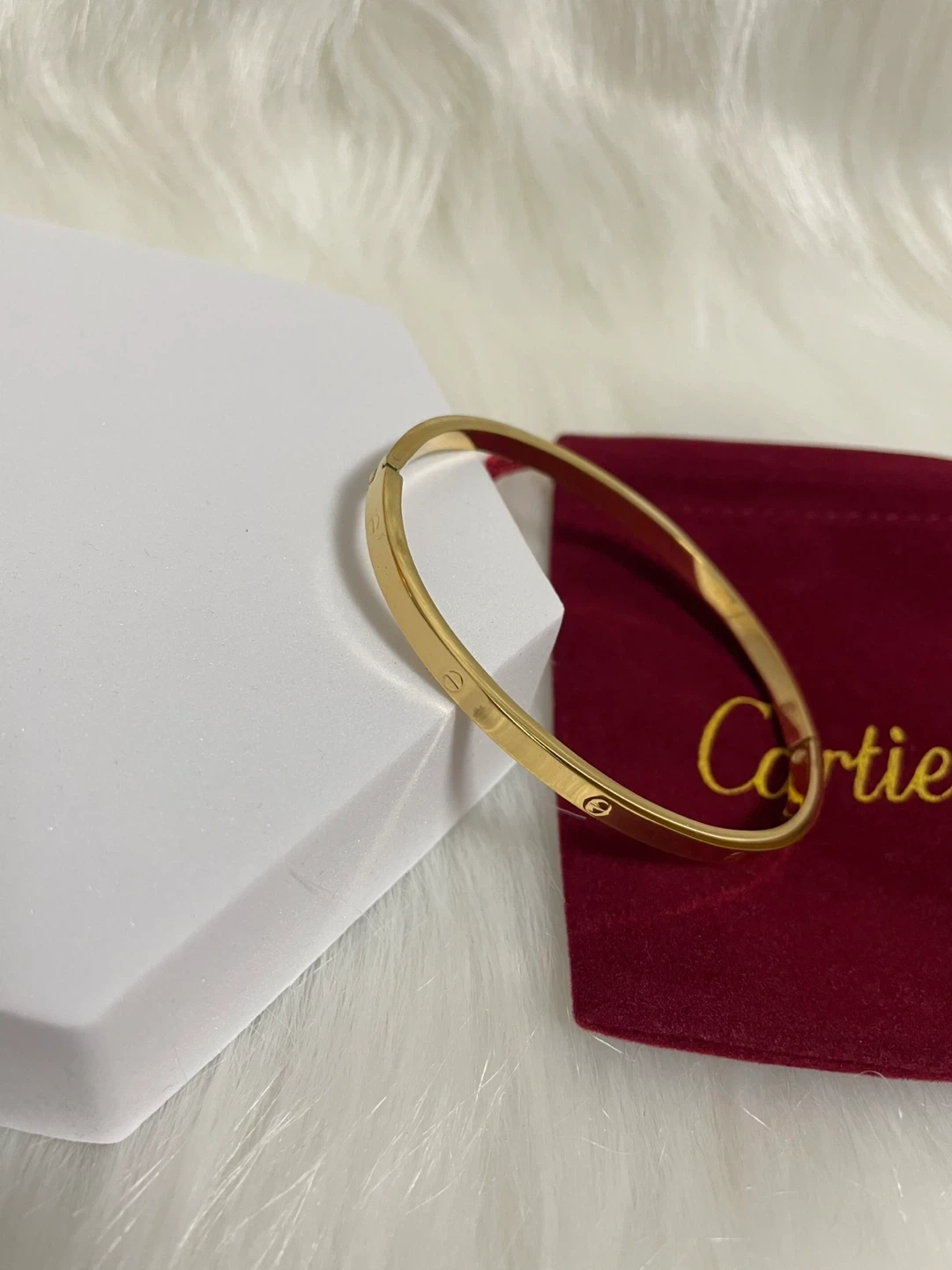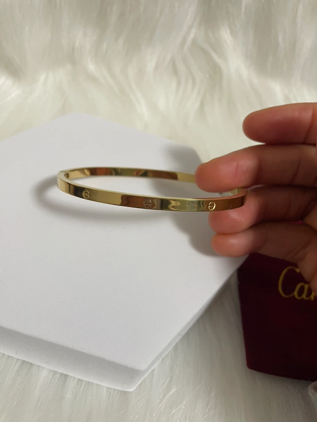 A classic Cartier Love bracelet in gold. This iconic piece features the brand's signature screw motif. It's a timeless accessory that adds a touch of elegance to any outfit.