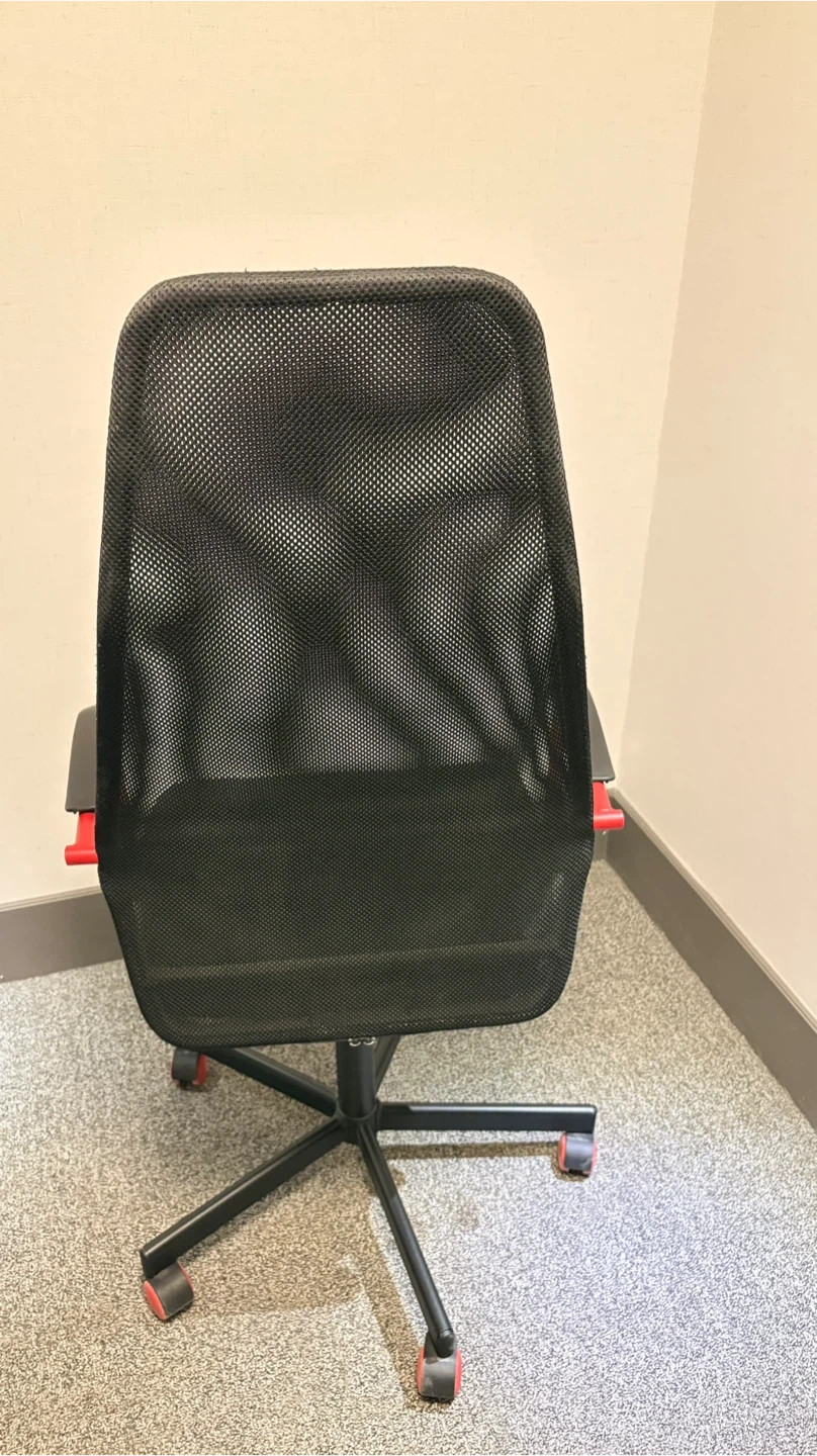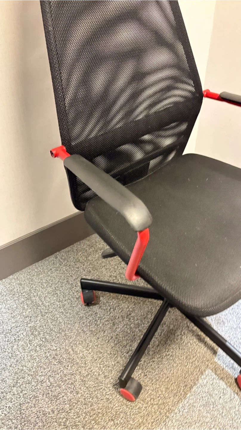 This is a black mesh office chair featuring red accents on the armrests and base. It has a breathable mesh back and a comfortable padded seat. Its five-wheel base ensures stability and easy mobility across your workspace.