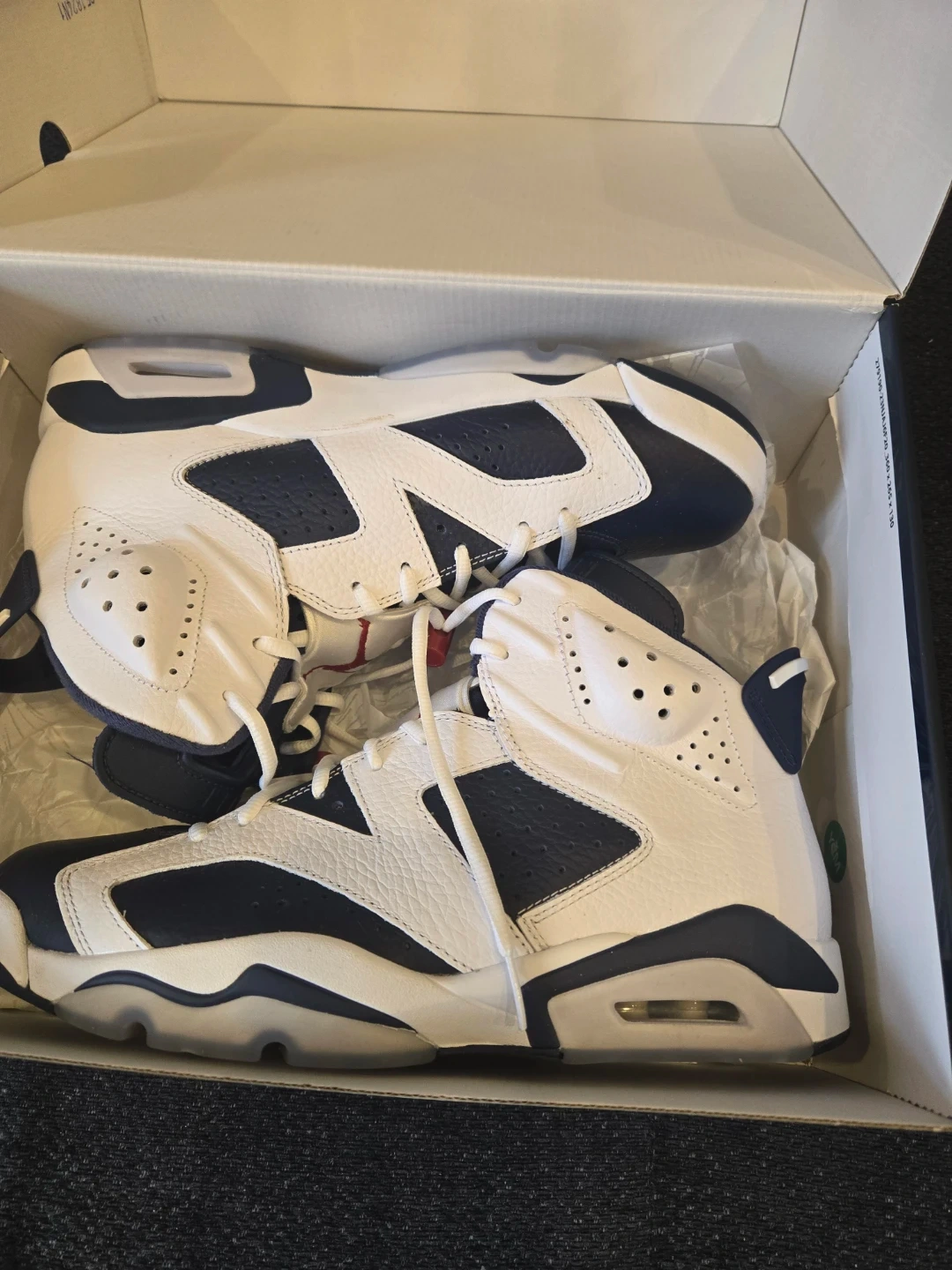 These Air Jordan 6 Retro sneakers come in a classic white and navy colourway. They're made with a mix of leather and synthetic materials. The original box is included. These kicks are a must-have for any sneaker enthusiast!