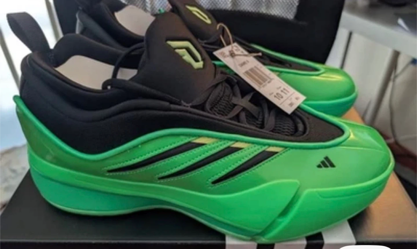 These Adidas Dame 8 basketball shoes come in a vibrant lime green and black colorway. They feature a responsive cushioning system for optimal performance on the court. The lace-up closure ensures a secure fit. Includes original box!