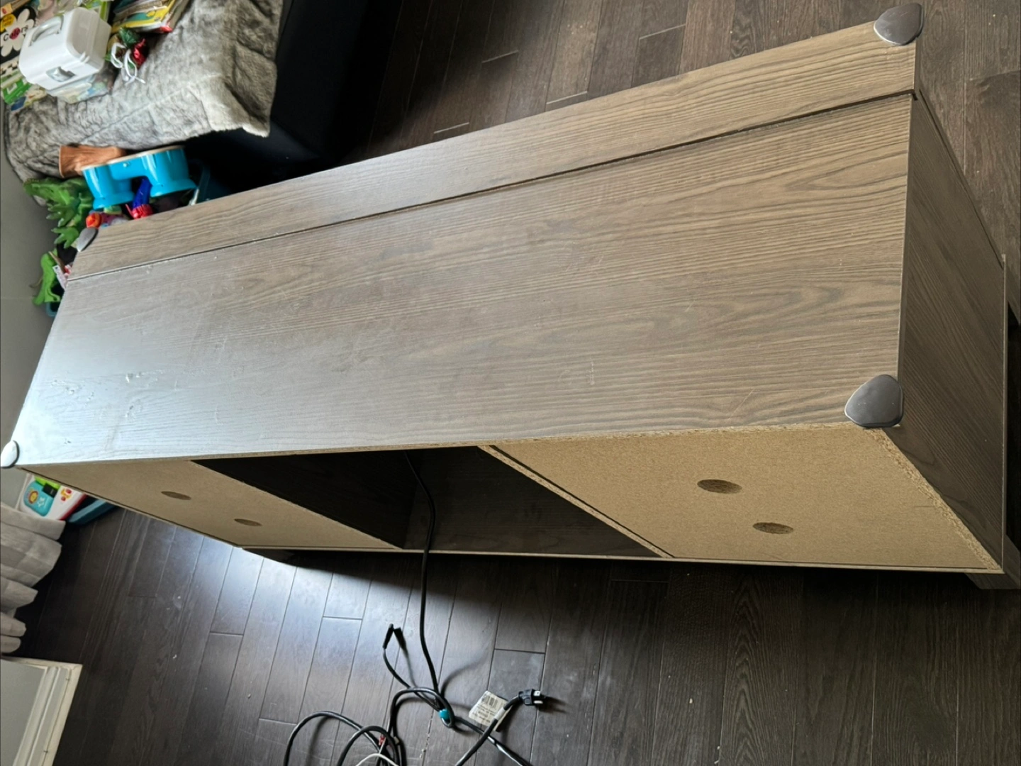 Brown woodgrain finish. Built-in electric fireplace. Multiple shelves for storage. Good condition. Some minor wear.