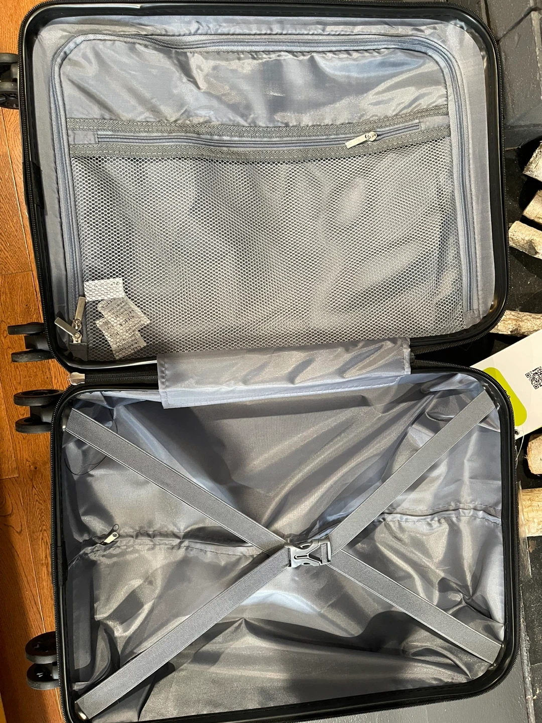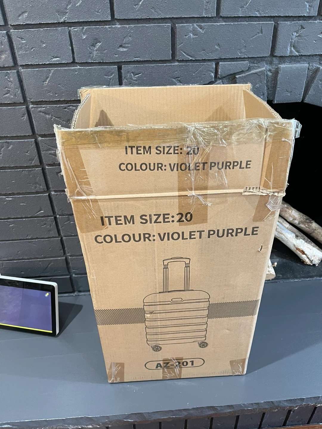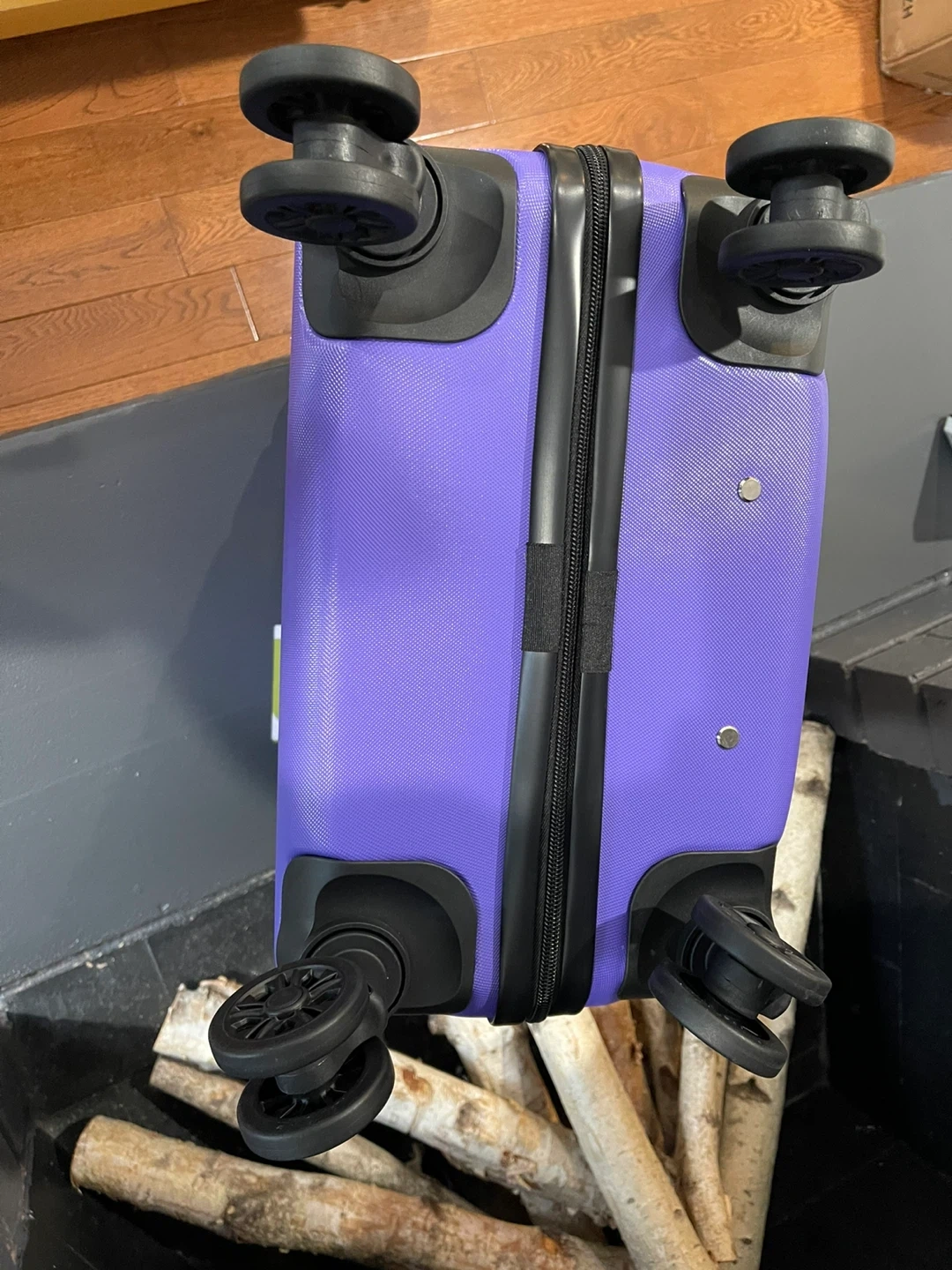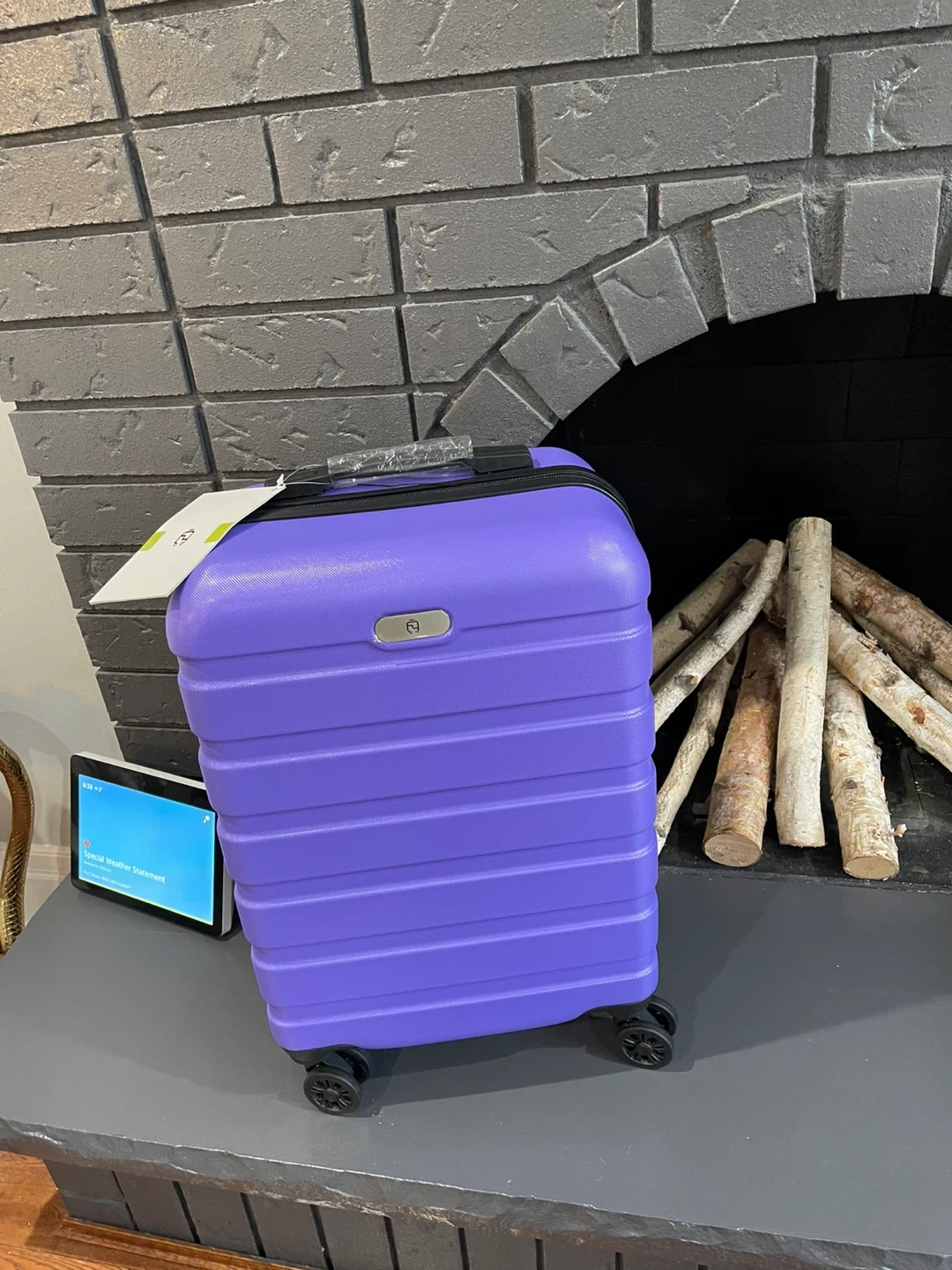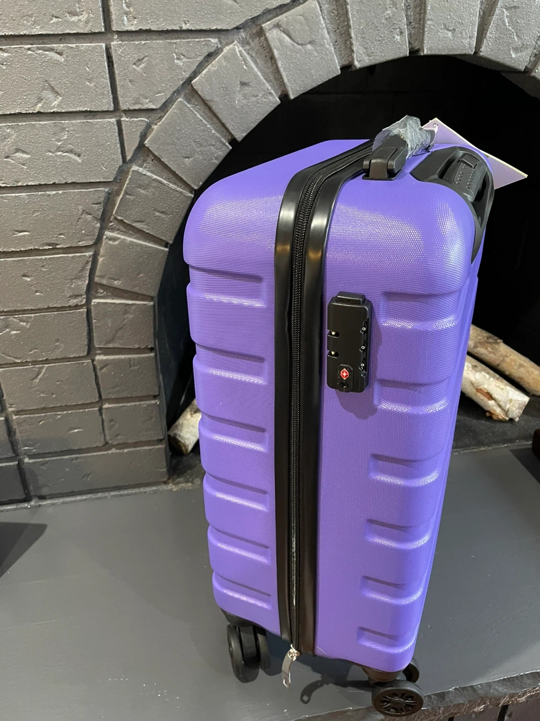 This is a purple hardside carry-on luggage. It features a TSA-approved lock. The interior has cross-straps and zippered compartments for organization.